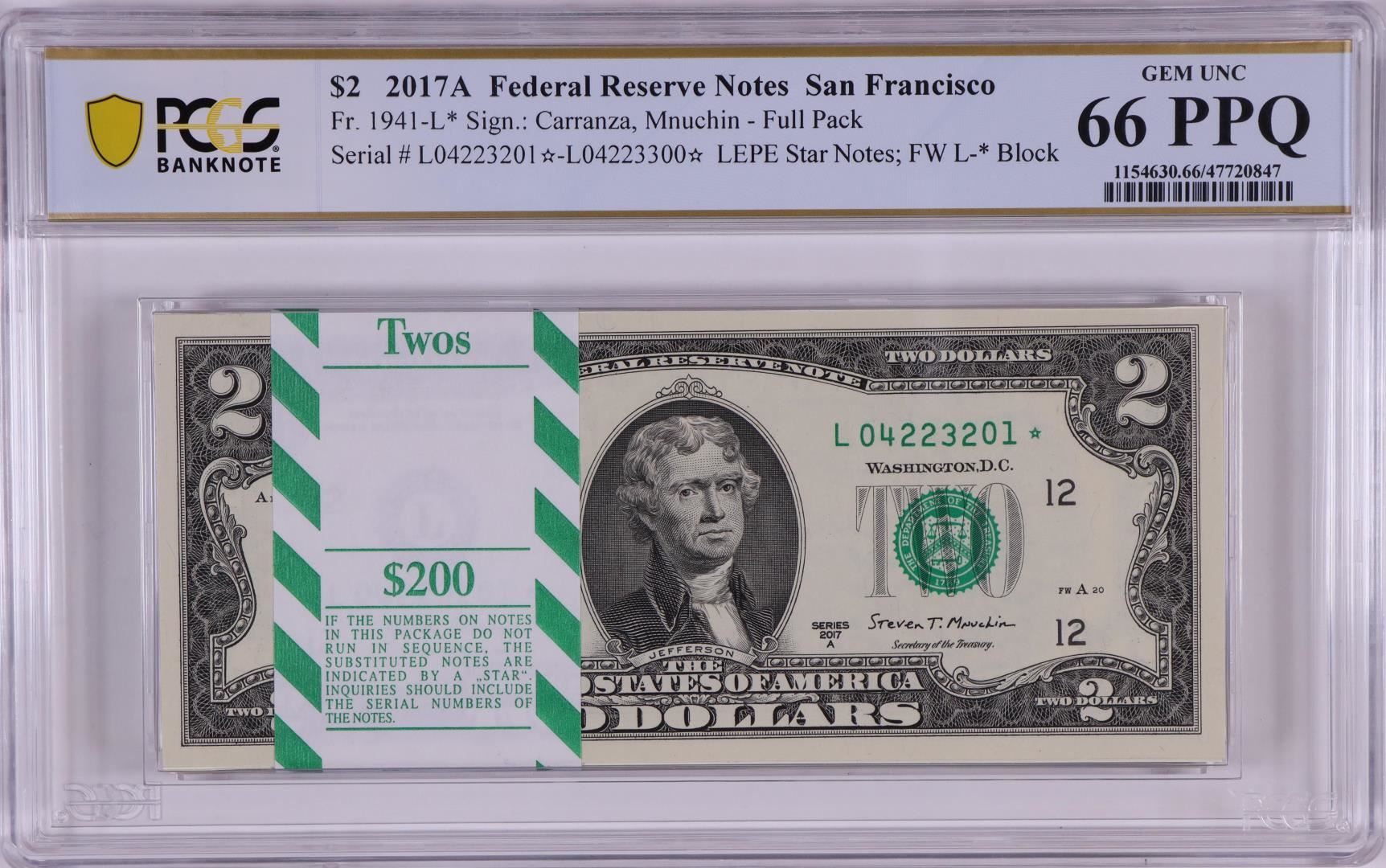 One Pack 2017A $2 Federal Reserve STAR Notes San Francisco Fr.1941-L* PCGS Gem UNC 66PPQ. PCGS Graded.