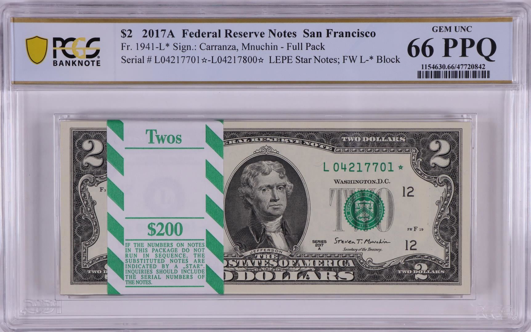 One Pack 2017A $2 Federal Reserve STAR Notes San Francisco Fr.1941-L* PCGS Gem UNC 66PPQ. PCGS Graded.