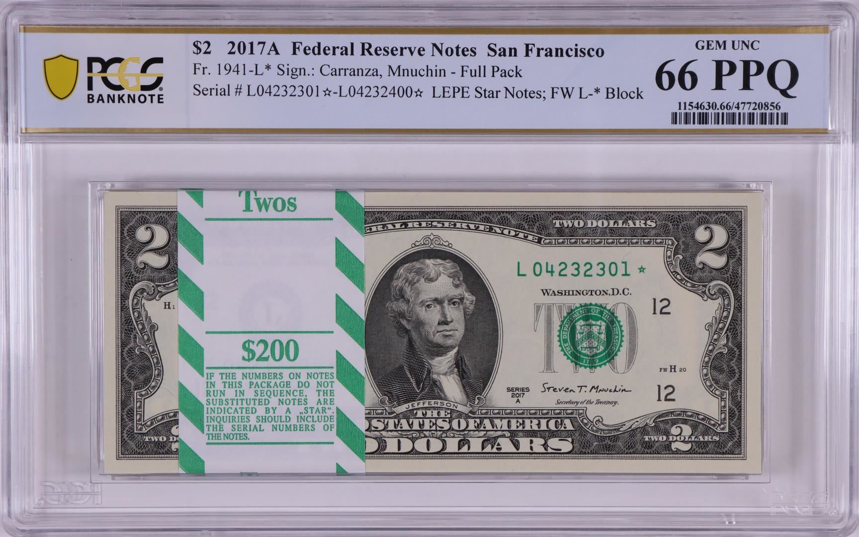 One Pack 2017A $2 Federal Reserve STAR Notes San Francisco Fr.1941-L* PCGS Gem UNC 66PPQ. PCGS Graded.