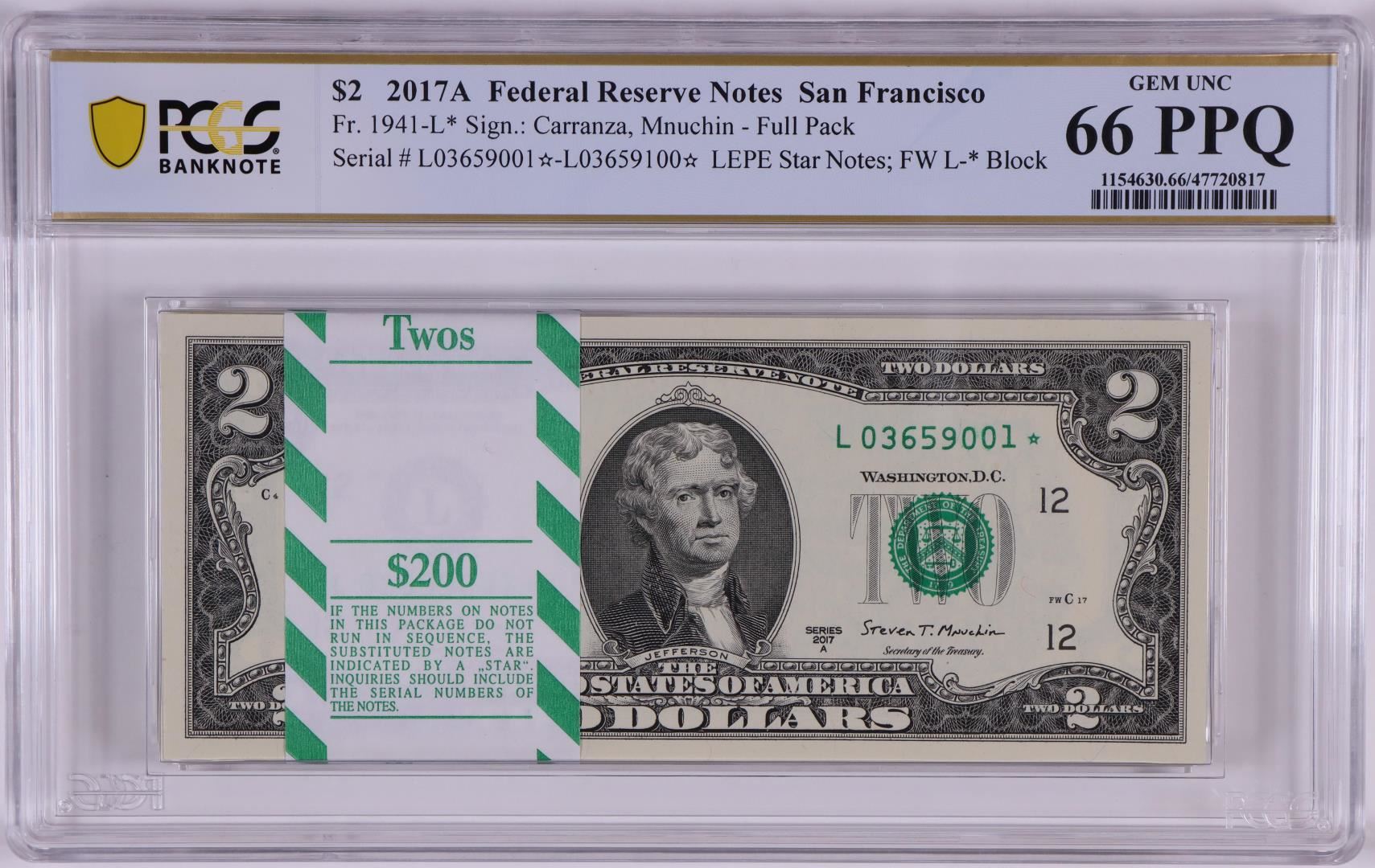 One Pack 2017A $2 Federal Reserve STAR Notes San Francisco Fr.1941-L* PCGS Gem UNC 66PPQ. PCGS Graded.
