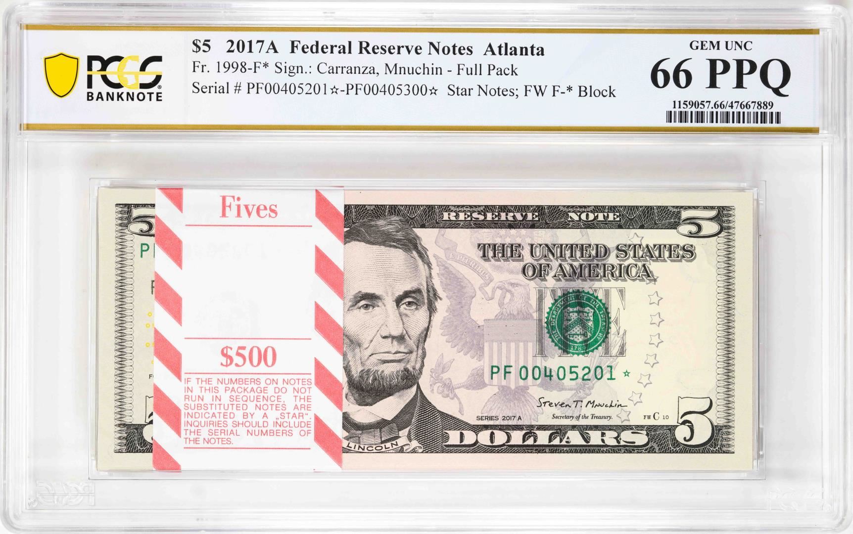 One Pack 2017A $5 Federal Reserve STAR Notes ATL Fr.1998-F* PCGS Gem Uncirculated 66PPQ. PCGS Graded.