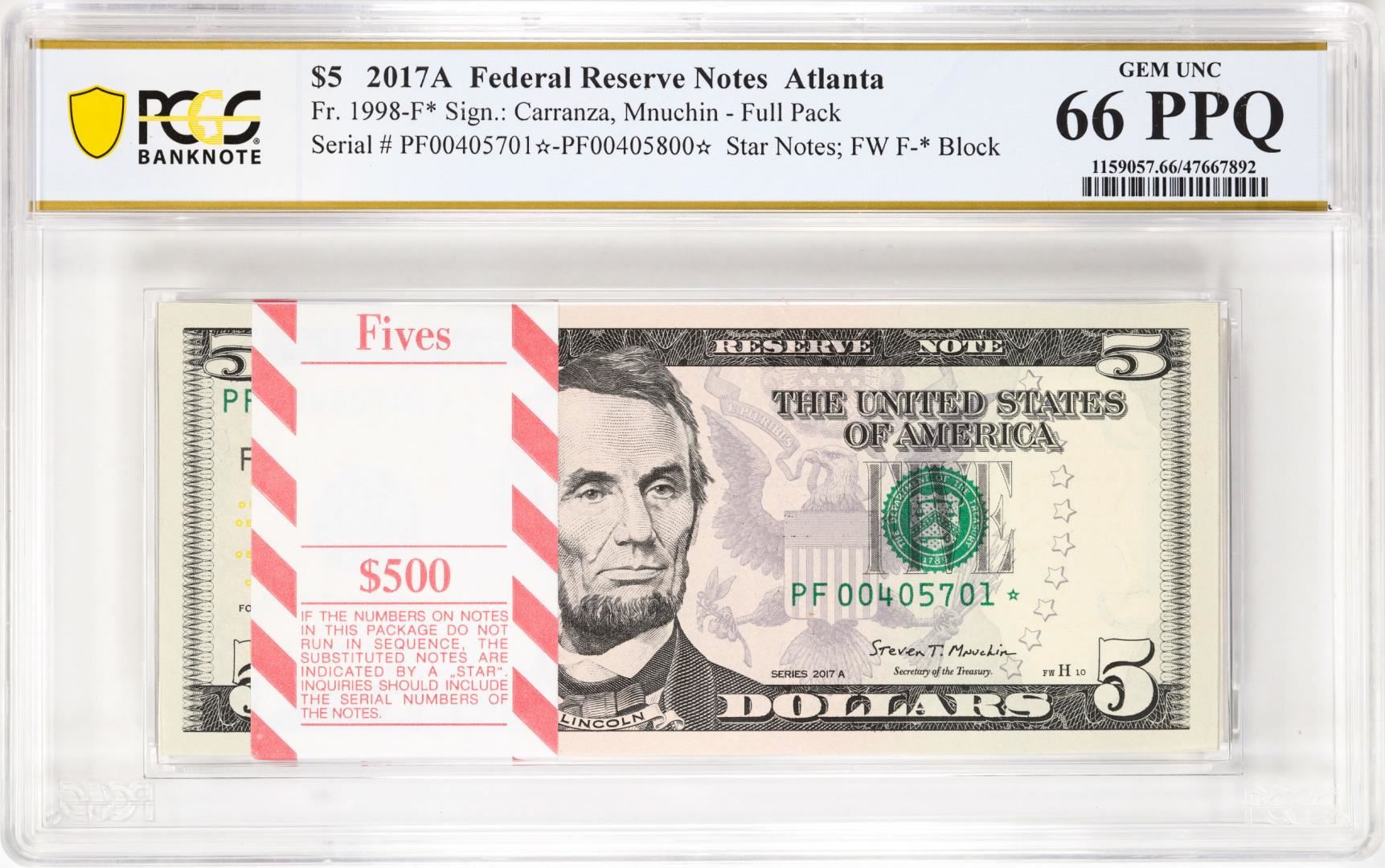 One Pack 2017A $5 Federal Reserve STAR Notes ATL Fr.1998-F* PCGS Gem Uncirculated 66PPQ. PCGS Graded.