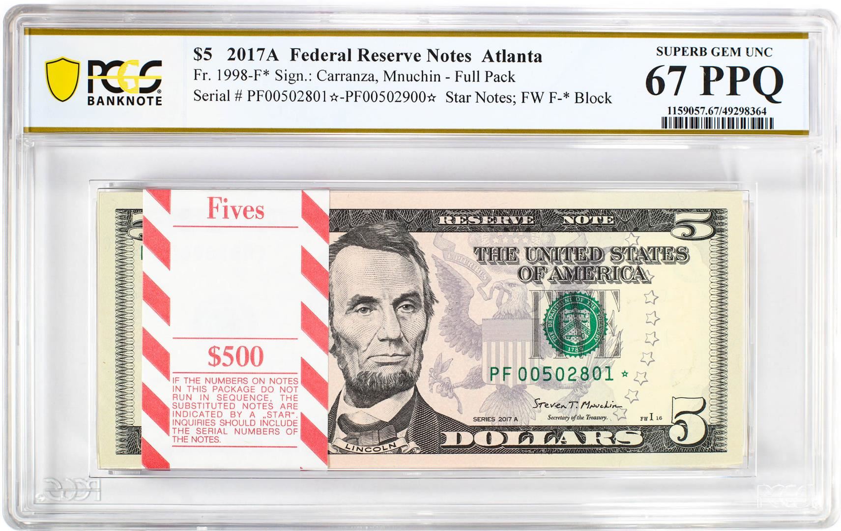 One Pack 2017A $5 Federal Reserve STAR Notes Atlanta Fr.1998-F* PCGS Superb Gem UNC 67PPQ. PCGS Graded.