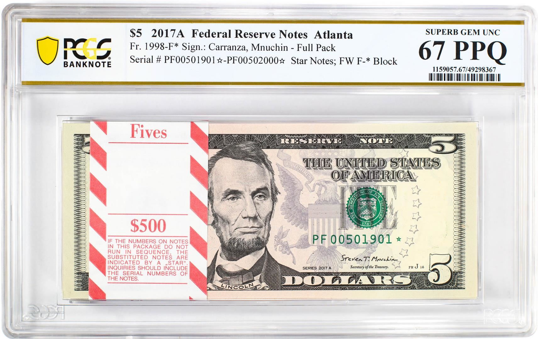 One Pack 2017A $5 Federal Reserve STAR Notes Atlanta Fr.1998-F* PCGS Superb Gem UNC 67PPQ. PCGS Graded.