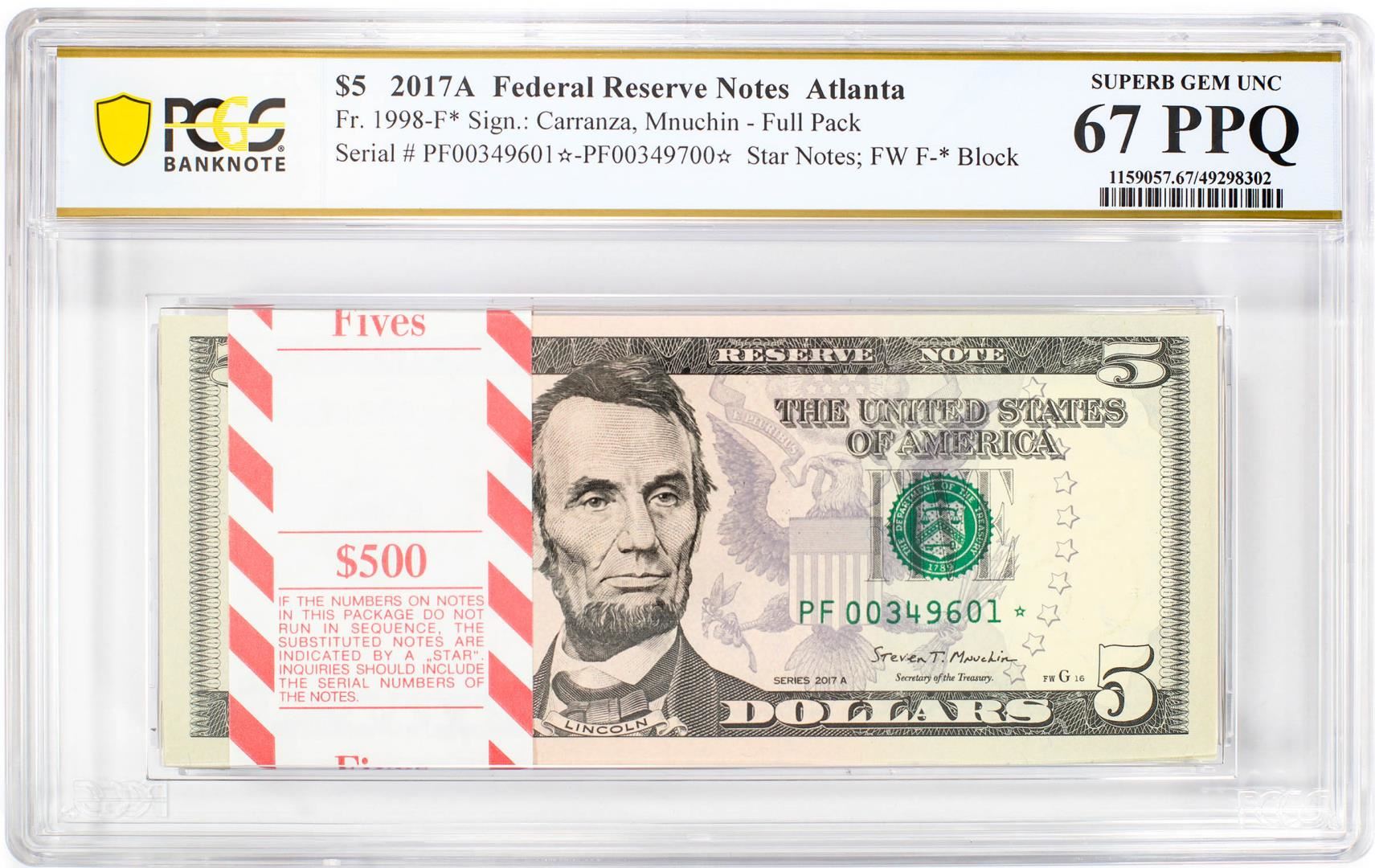 One Pack 2017A $5 Federal Reserve STAR Notes Atlanta Fr.1998-F* PCGS Superb Gem UNC 67PPQ. PCGS Graded.