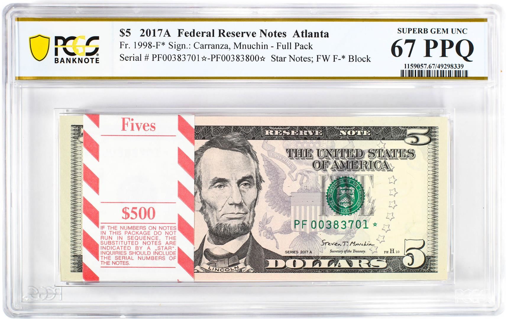 One Pack 2017A $5 Federal Reserve STAR Notes Atlanta Fr.1998-F* PCGS Superb Gem UNC 67PPQ. PCGS Graded.