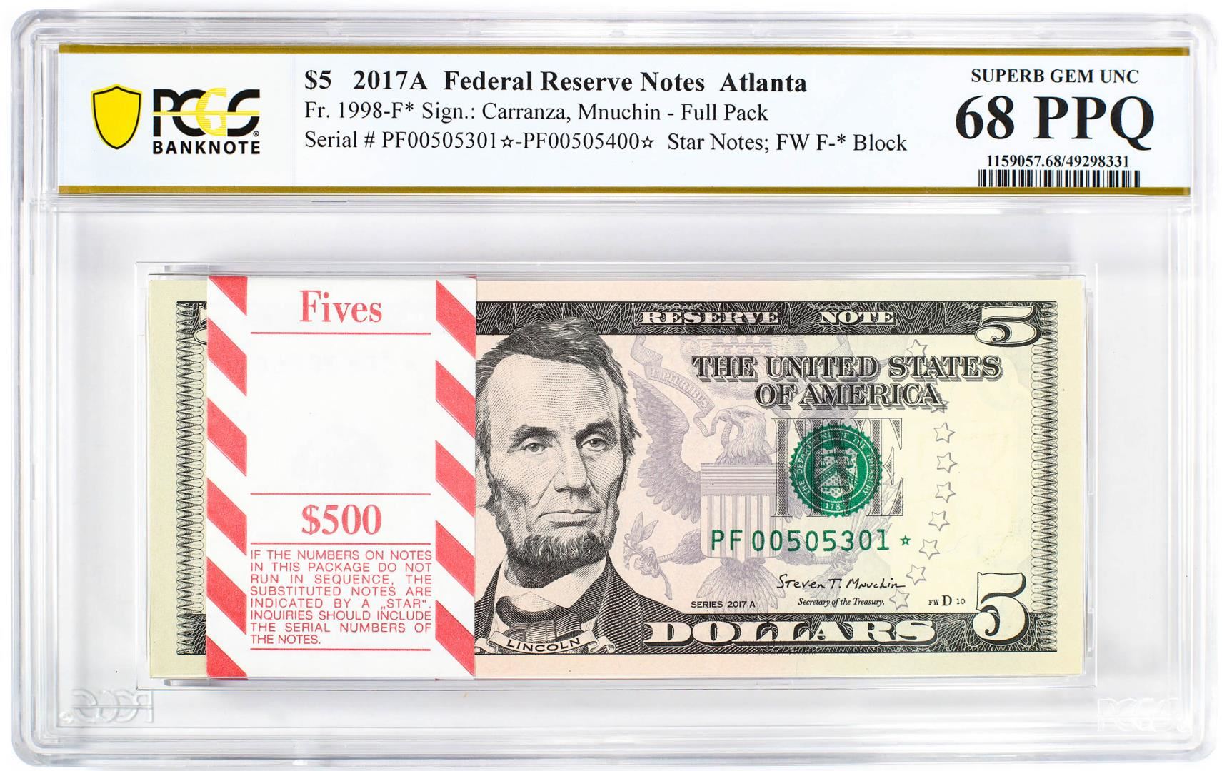 One Pack 2017A $5 Federal Reserve STAR Notes Atlanta Fr.1998-F* PCGS Superb Gem UNC 68PPQ. PCGS Graded.