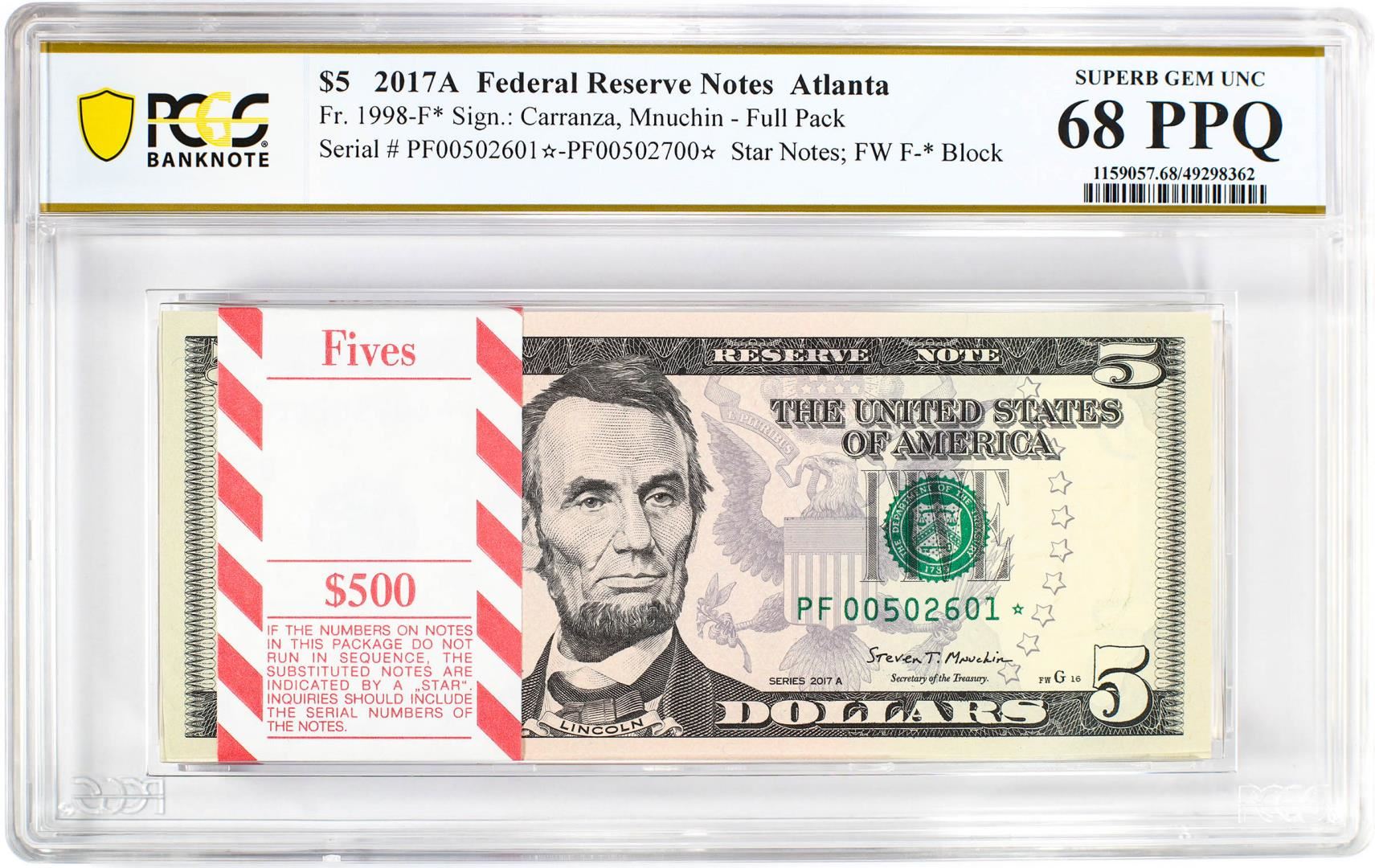 One Pack 2017A $5 Federal Reserve STAR Notes Atlanta Fr.1998-F* PCGS Superb Gem UNC 68PPQ. PCGS Graded.