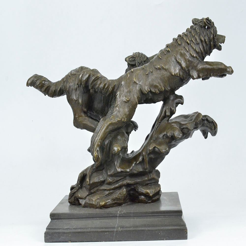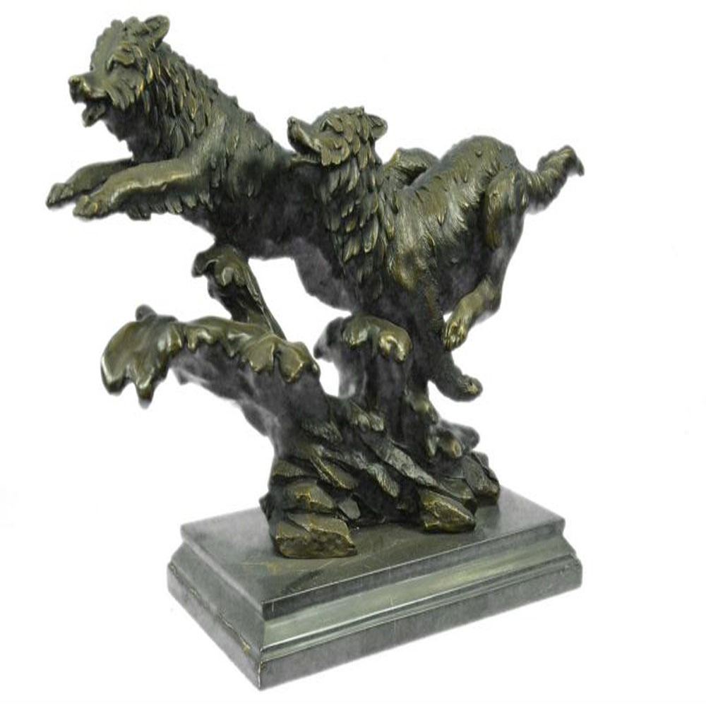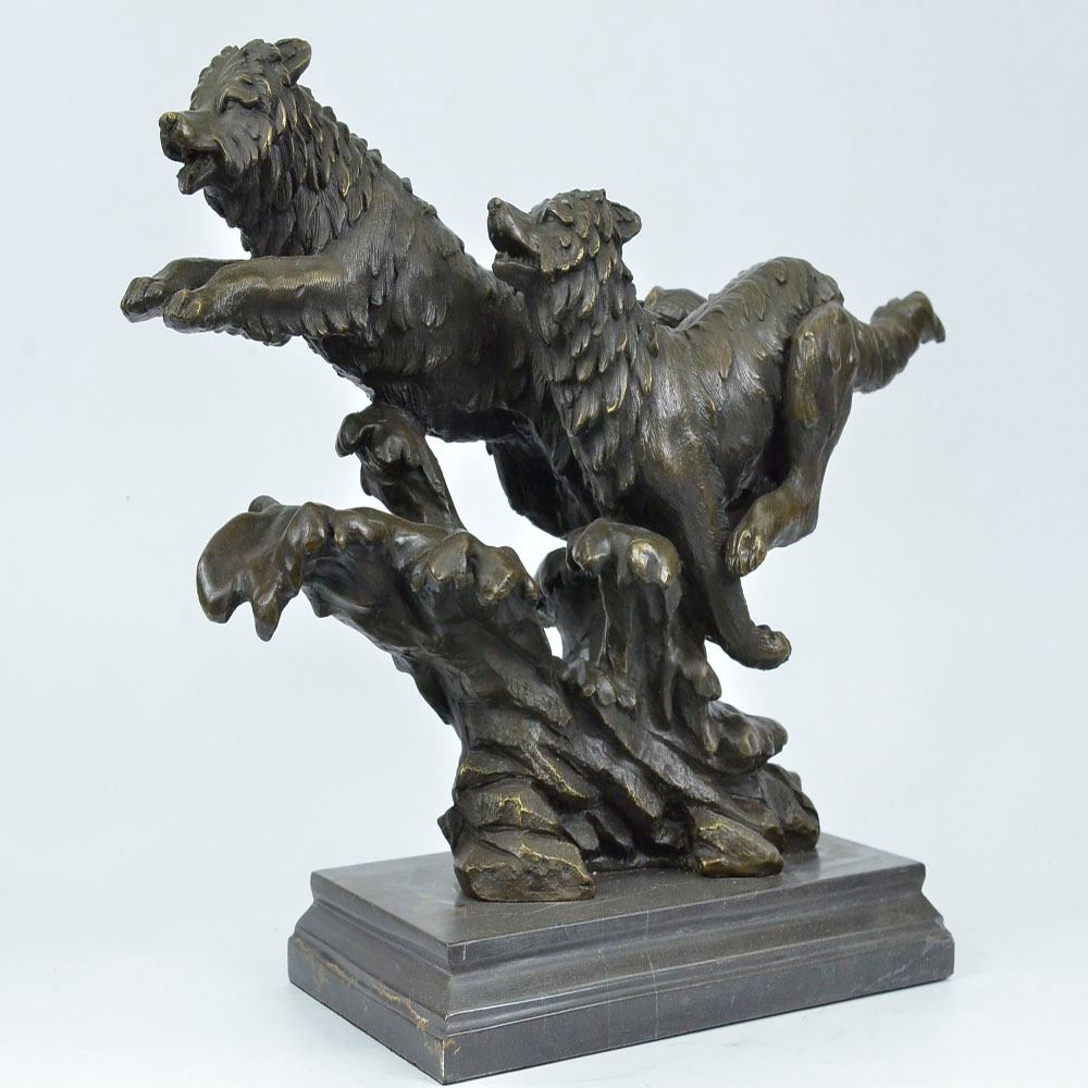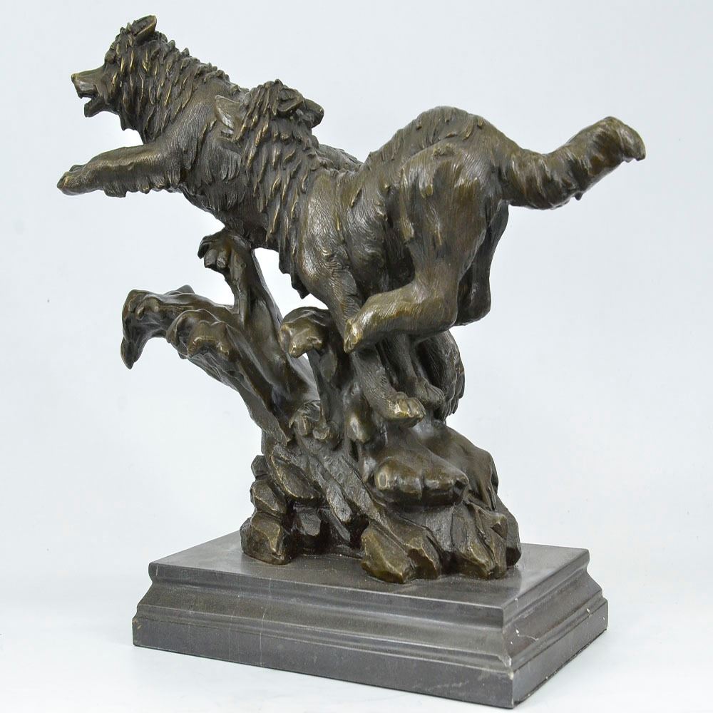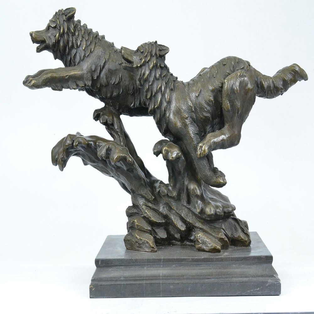Wolves, just the word sends chills into the heart of man, either of deep hatred or great reverence. Whether loved or hated, there is no denying this creature is a highly social animal, totally committed to and concerned for the welfare of their family. His world has become a considerably smaller place to raise a family. So it is with man, our world is rapidly shrinking as well, despite the fact there are many wide open spaces not yet used or developed. Seems we all want the same places, the same privileges, the same opportunities. It is made of 100% bronze and cast through the Lost Wax Method. Bronze Dimensions with Marble Base: Height 13 X Width 18 inches. Weight: 30 LBS.