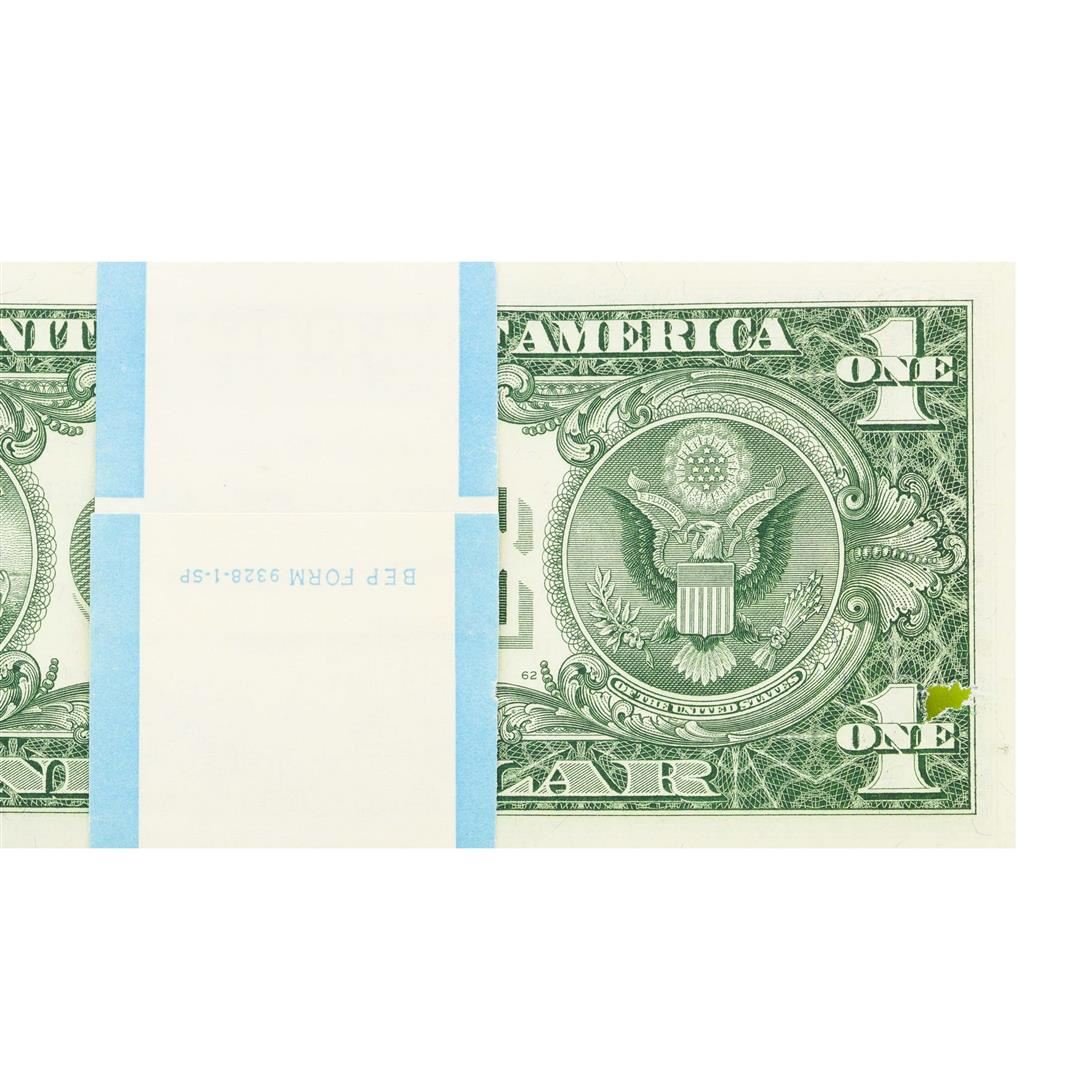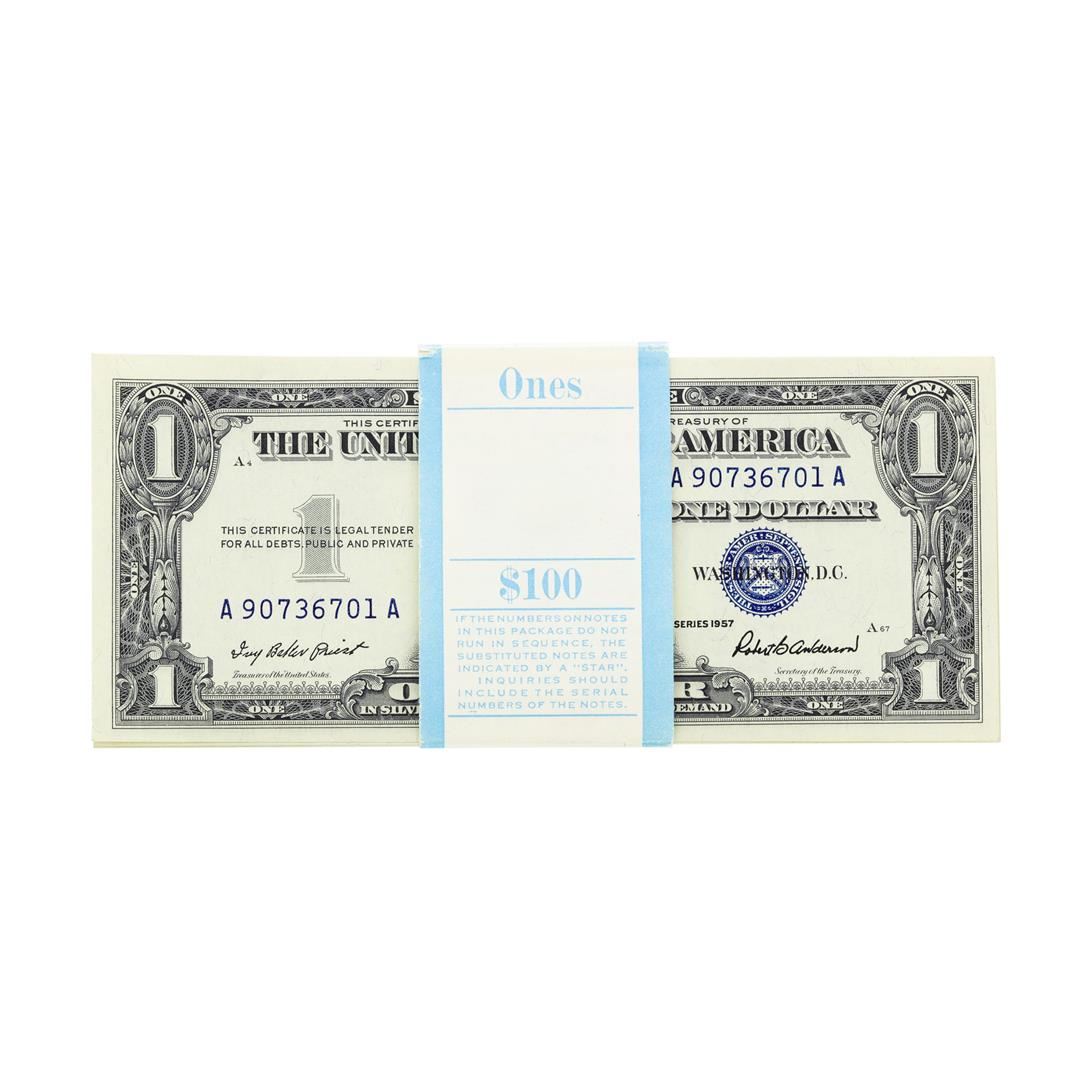 One Pack of (100) 1957 $1 Silver Certificate Notes Uncirculated however the last note has a hole in the bottom right corner which can be seen in image #3.