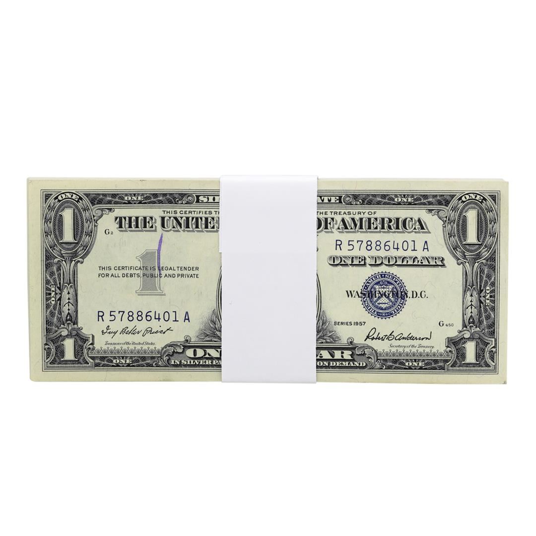 One Pack of (100) Consecutive 1957 $1 Silver Certificate Notes, the pack does have some paper clip indentations throughout the pack but overall the pack is in uncirculated condition.