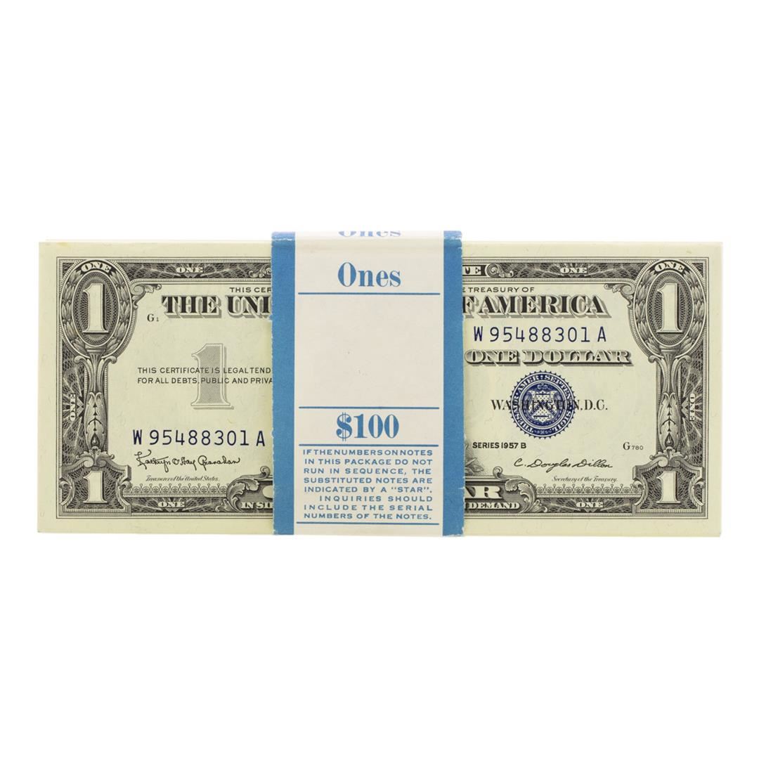 One Pack of (100) Consecutive 1957B $1 Silver Certificate Notes.