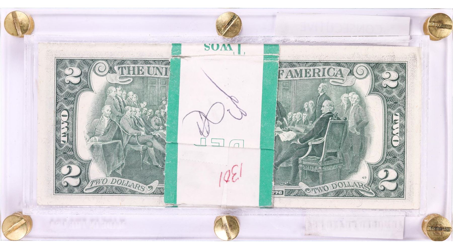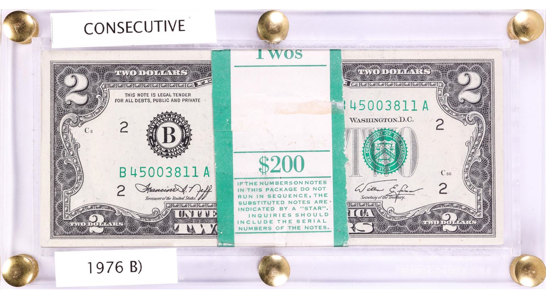 One Pack of (100) Consecutive 1976 $2 Federal Reserve Notes New York in Holder.