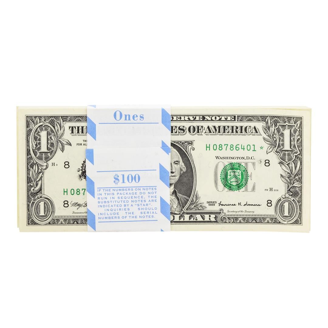 One Pack of (100) Consecutive 1999 $1 Federal Reserve STAR Notes St. Louis.