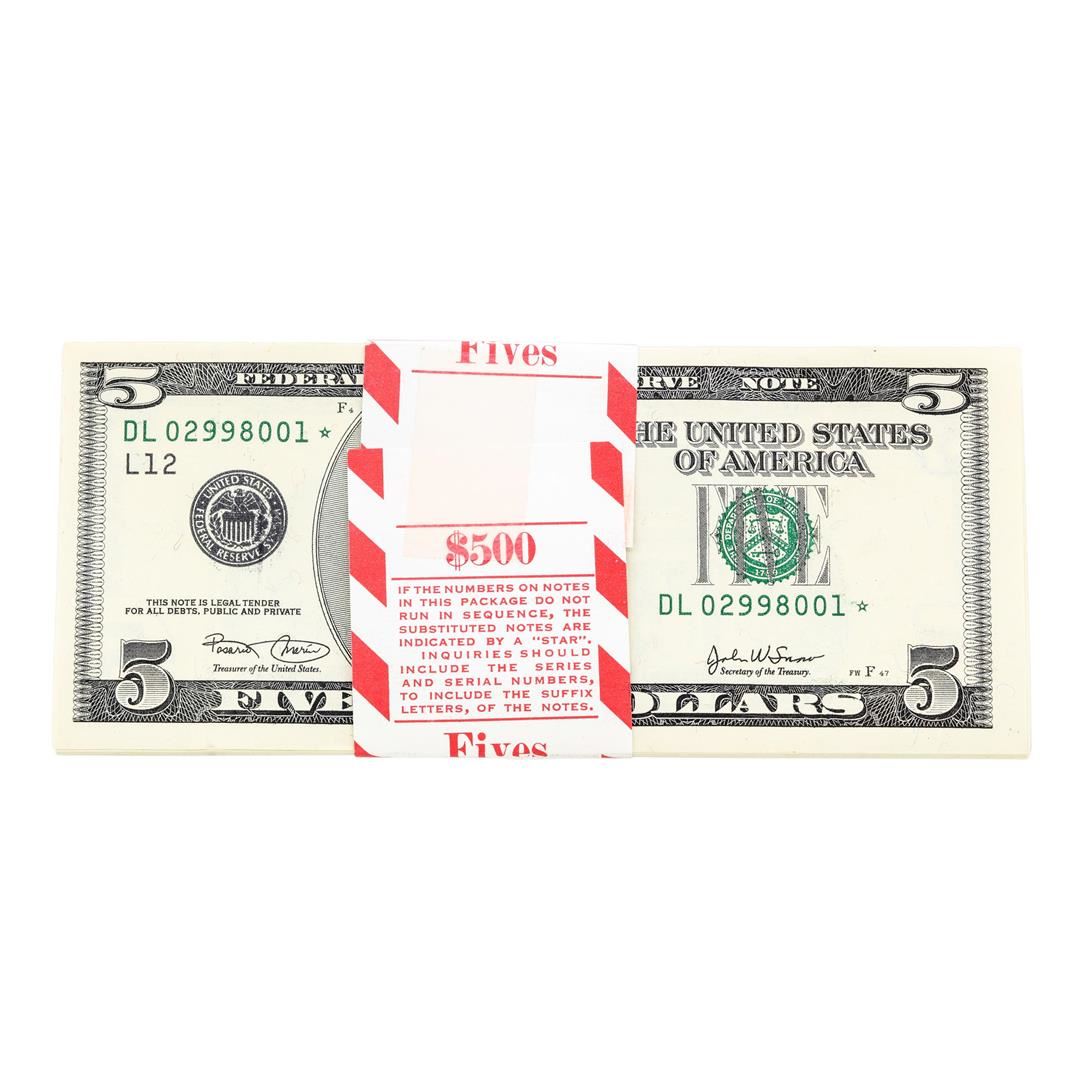 One Pack of (100) Consecutive 2003 $5 Federal Reserve STAR Notes.