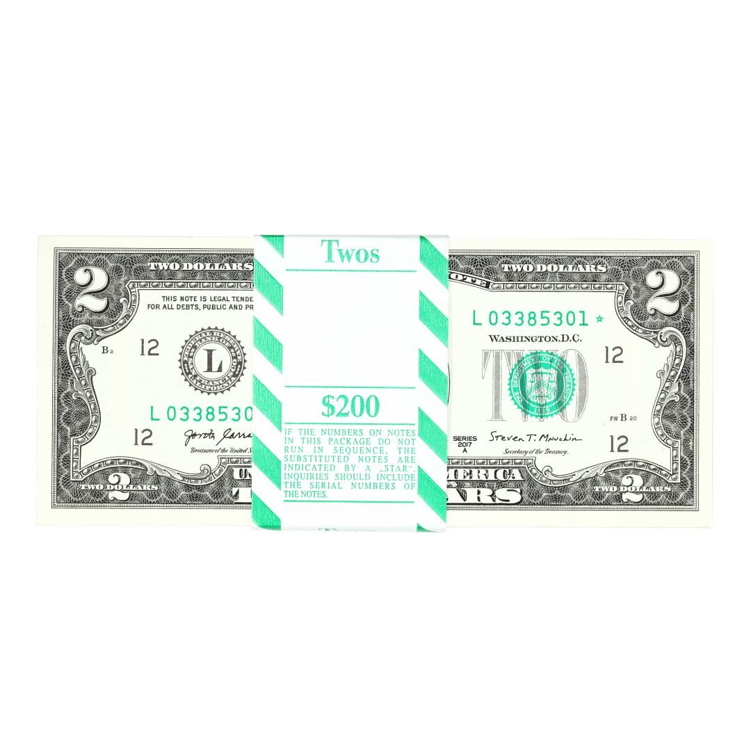 Pack of (100) Consecutive 2017A $2 Federal Reserve Star Notes San Francisco