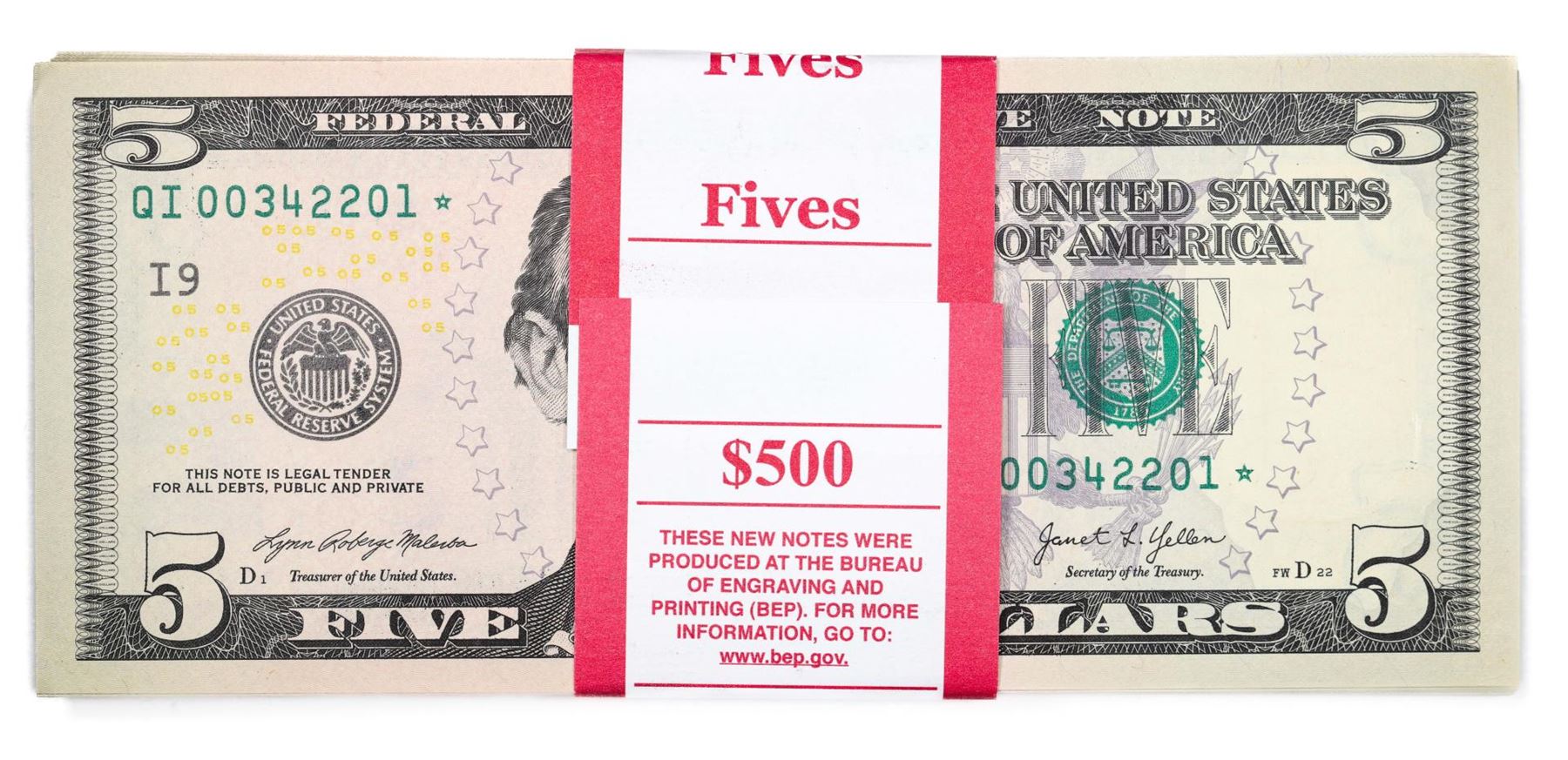 Pack of (100) Consecutive 2021 $5 Federal Reserve Star Notes
