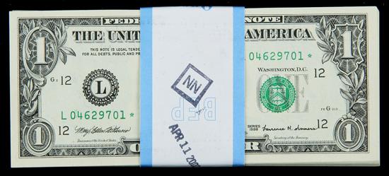 Pack of 100 Star Notes 1999, $1 Federal Reserve Notes.