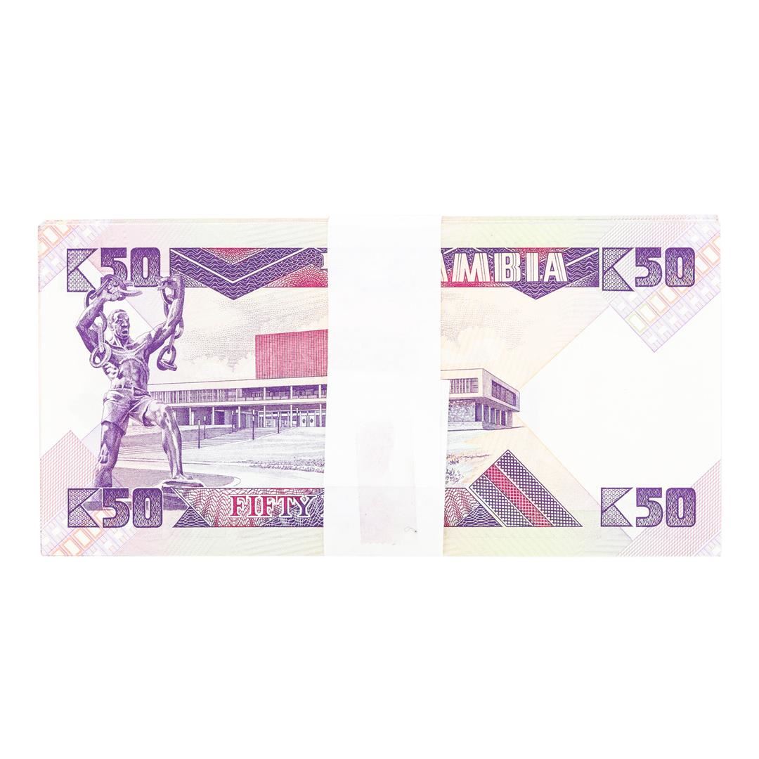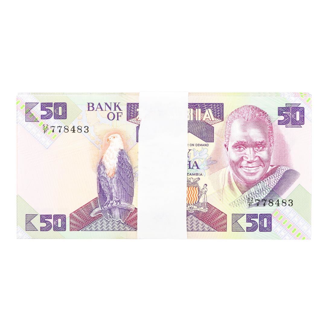 One Pack of (100) Zambia 50 Kawacha Uncirculated Notes.