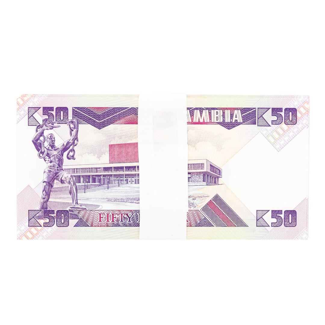 One Pack of (100) Zambia 50 Kawacha Uncirculated Notes.
