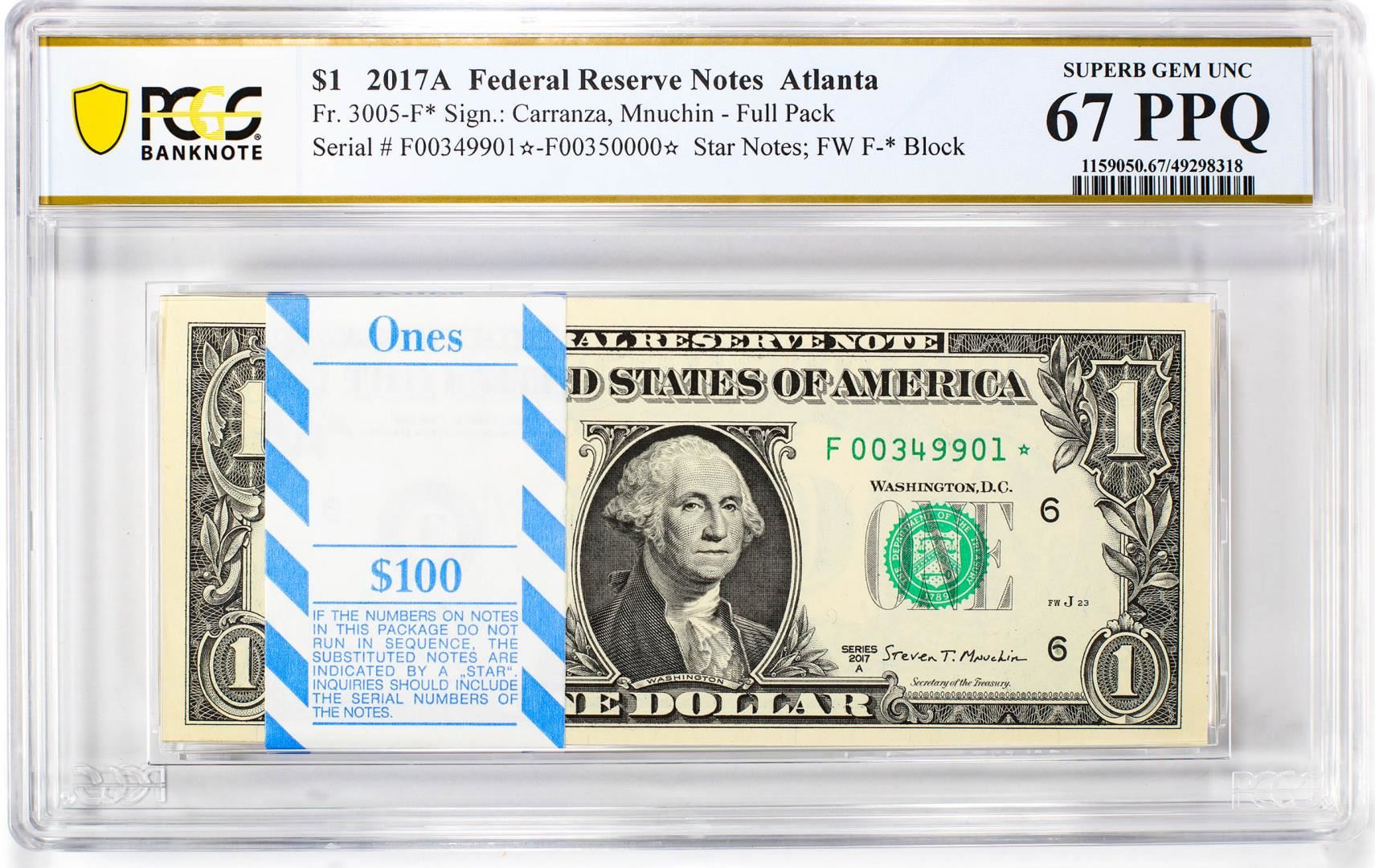 One Pack of 2017A $1 Federal Reserve STAR Notes ATL Fr.3005-F* PCGS Superb Gem UNC 67PPQ. PCGS Graded.