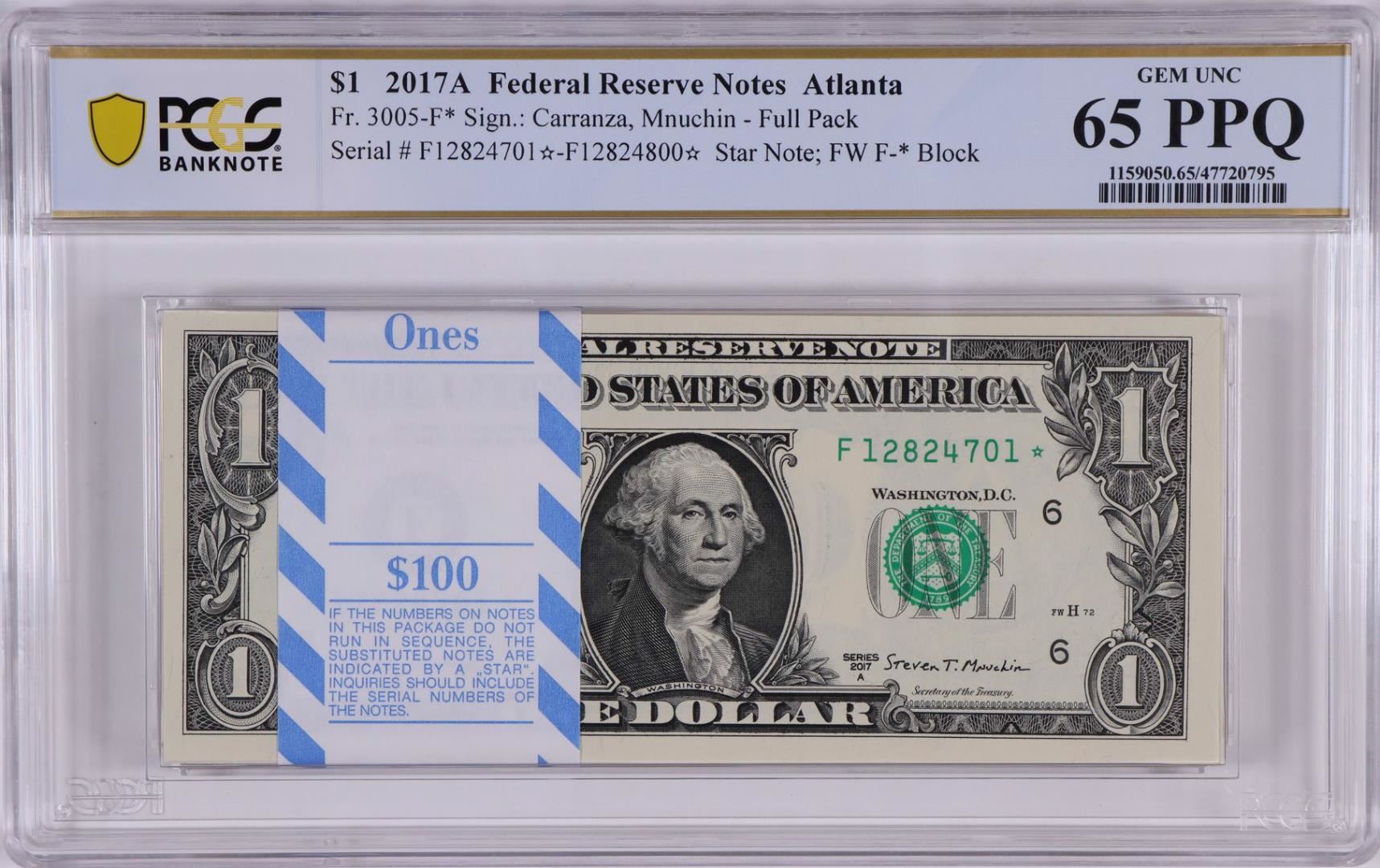 One Pack of 2017A $1 Federal Reserve STAR Notes Atlanta Fr.3005-F* PCGS Gem UNC 65PPQ. PCGS Graded.