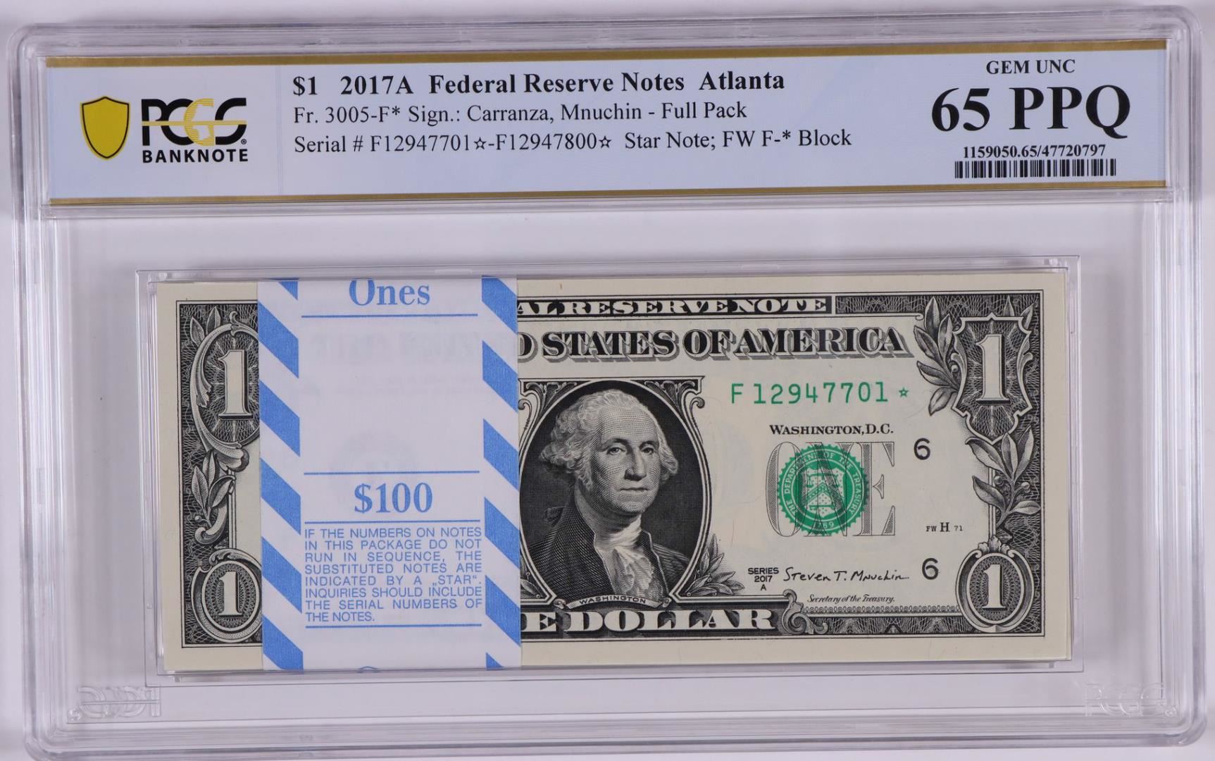 One Pack of 2017A $1 Federal Reserve STAR Notes Atlanta Fr.3005-F* PCGS Gem UNC 65PPQ. PCGS Graded.