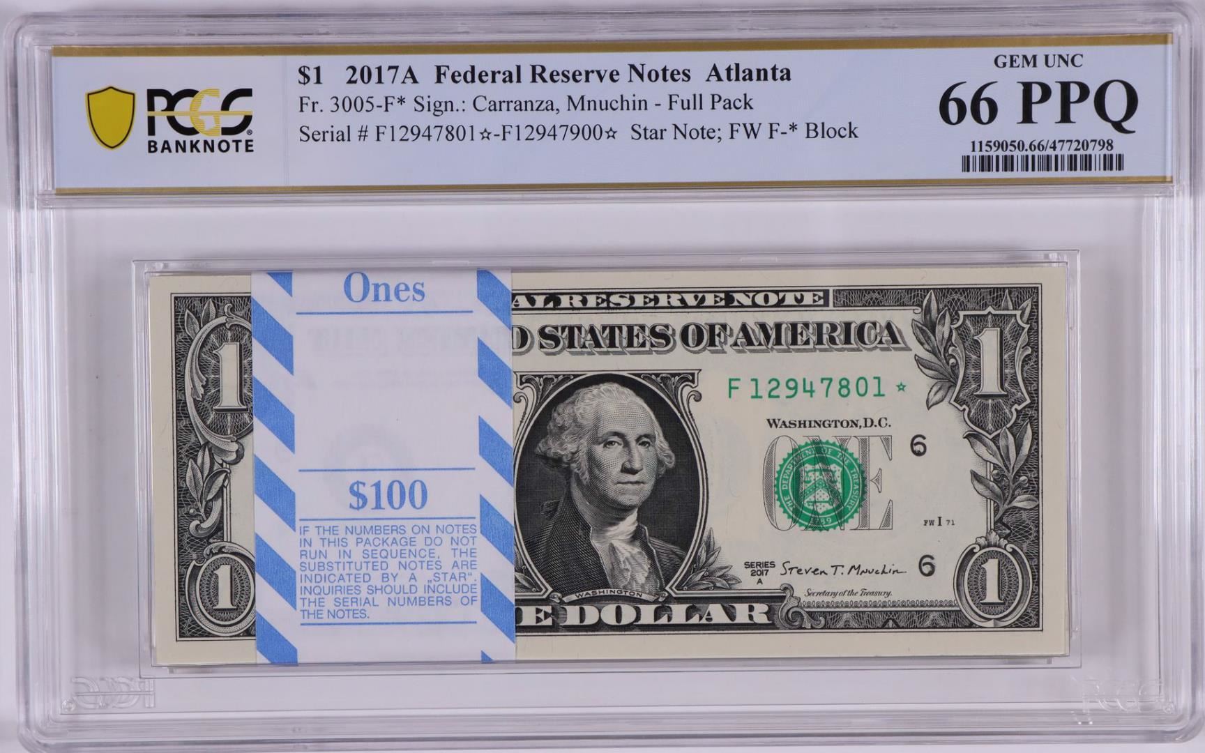 One Pack of 2017A $1 Federal Reserve STAR Notes Atlanta Fr.3005-F* PCGS Gem UNC 66PPQ. PCGS Graded.