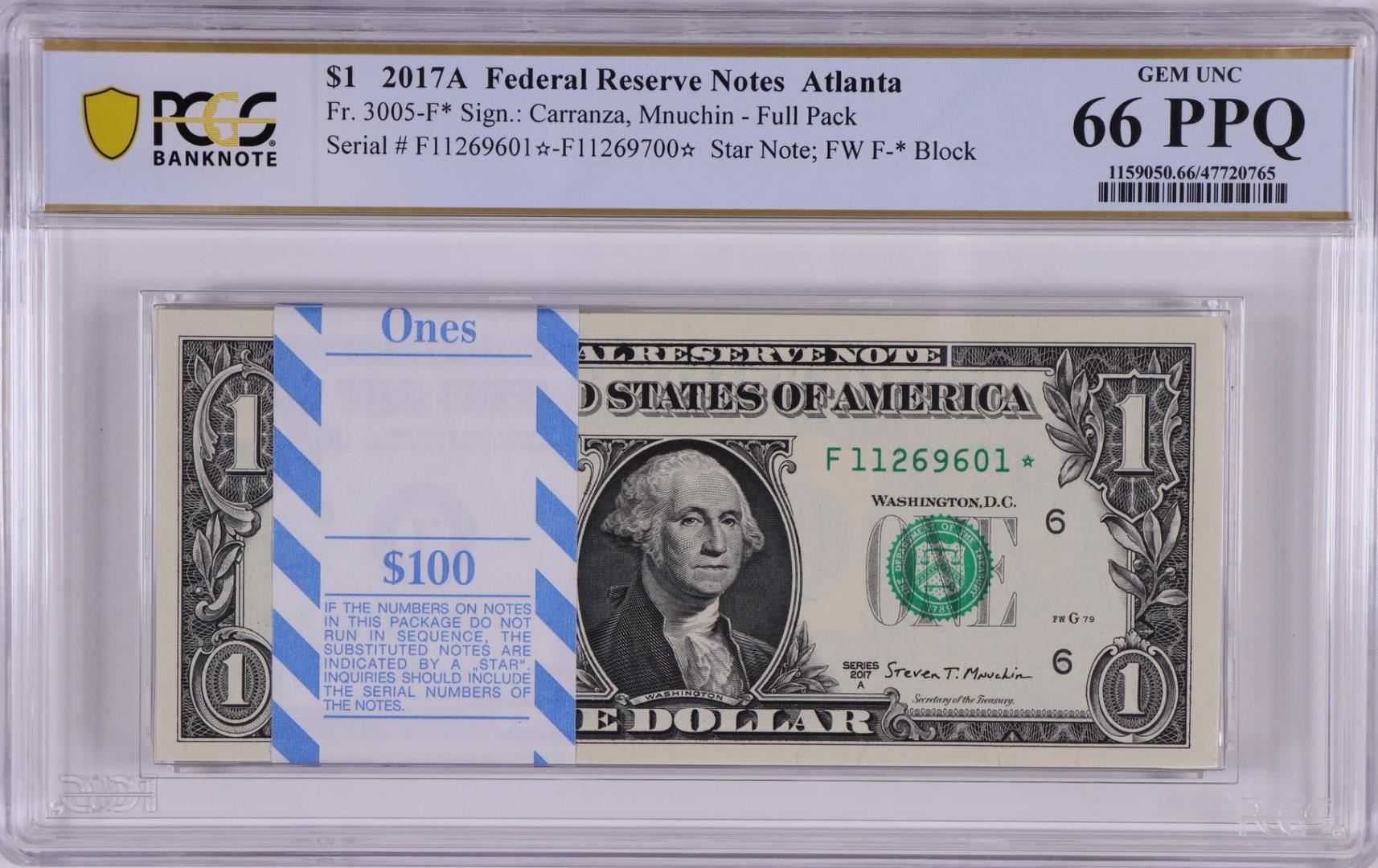 One Pack of 2017A $1 Federal Reserve STAR Notes Atlanta Fr.3005-F* PCGS Gem UNC 66PPQ. PCGS Graded.