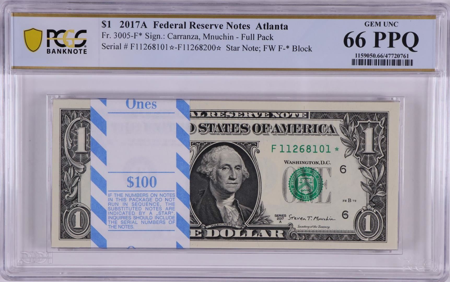 One Pack of 2017A $1 Federal Reserve STAR Notes Atlanta Fr.3005-F* PCGS Gem UNC 66PPQ. PCGS Graded.