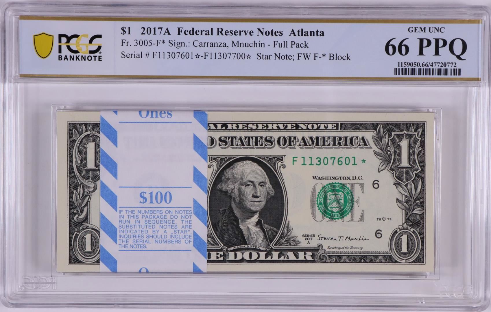 One Pack of 2017A $1 Federal Reserve STAR Notes Atlanta Fr.3005-F* PCGS Gem UNC 66PPQ. PCGS Graded.