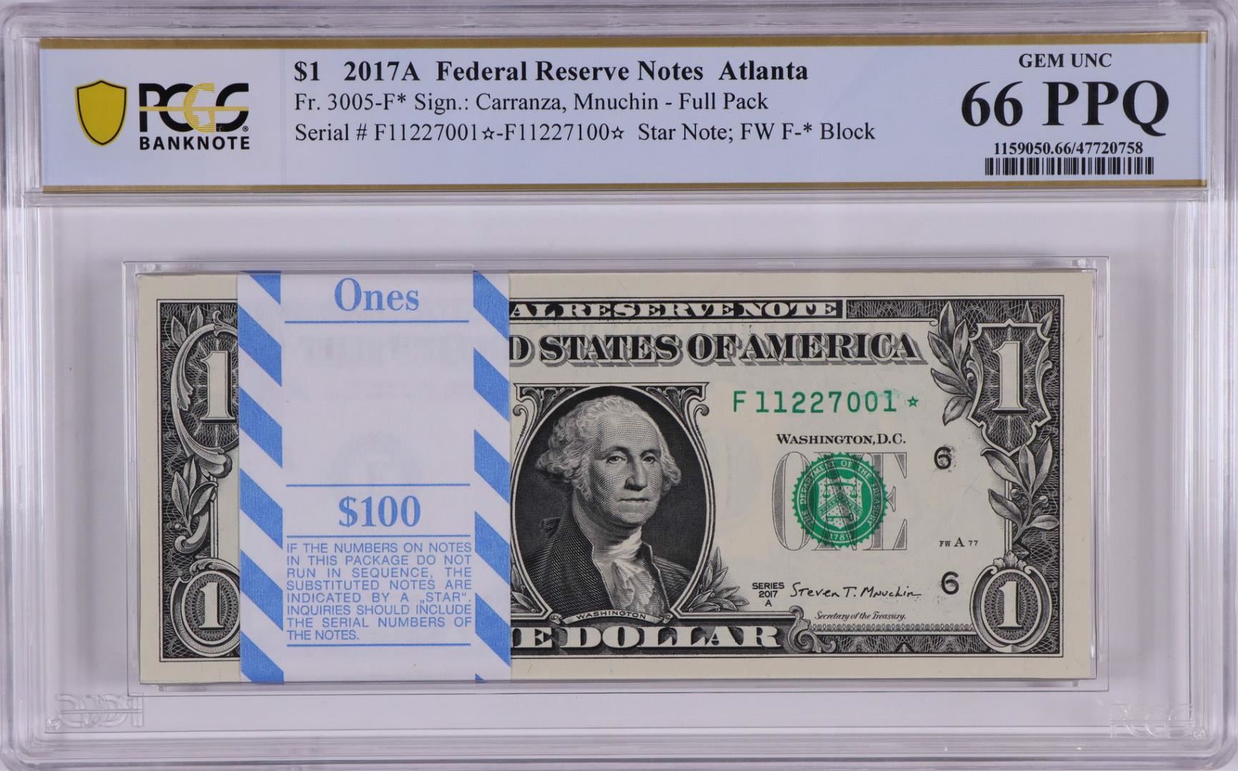 One Pack of 2017A $1 Federal Reserve STAR Notes Atlanta Fr.3005-F* PCGS Gem UNC 66PPQ. PCGS Graded.