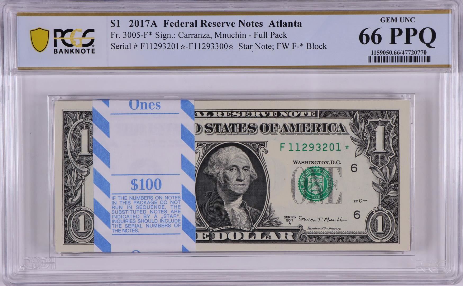One Pack of 2017A $1 Federal Reserve STAR Notes Atlanta Fr.3005-F* PCGS Gem UNC 66PPQ. PCGS Graded.