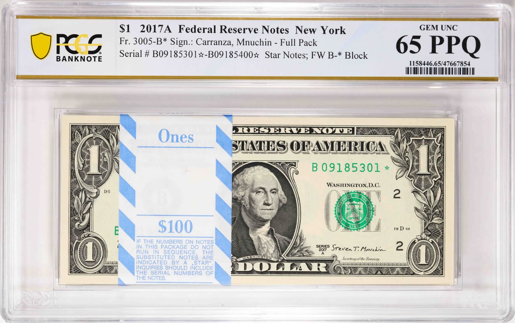 One Pack of 2017A $1 Federal Reserve STAR Notes New York Fr.3005-B* PCGS Gem Unc 65PPQ. PCGS Graded.
