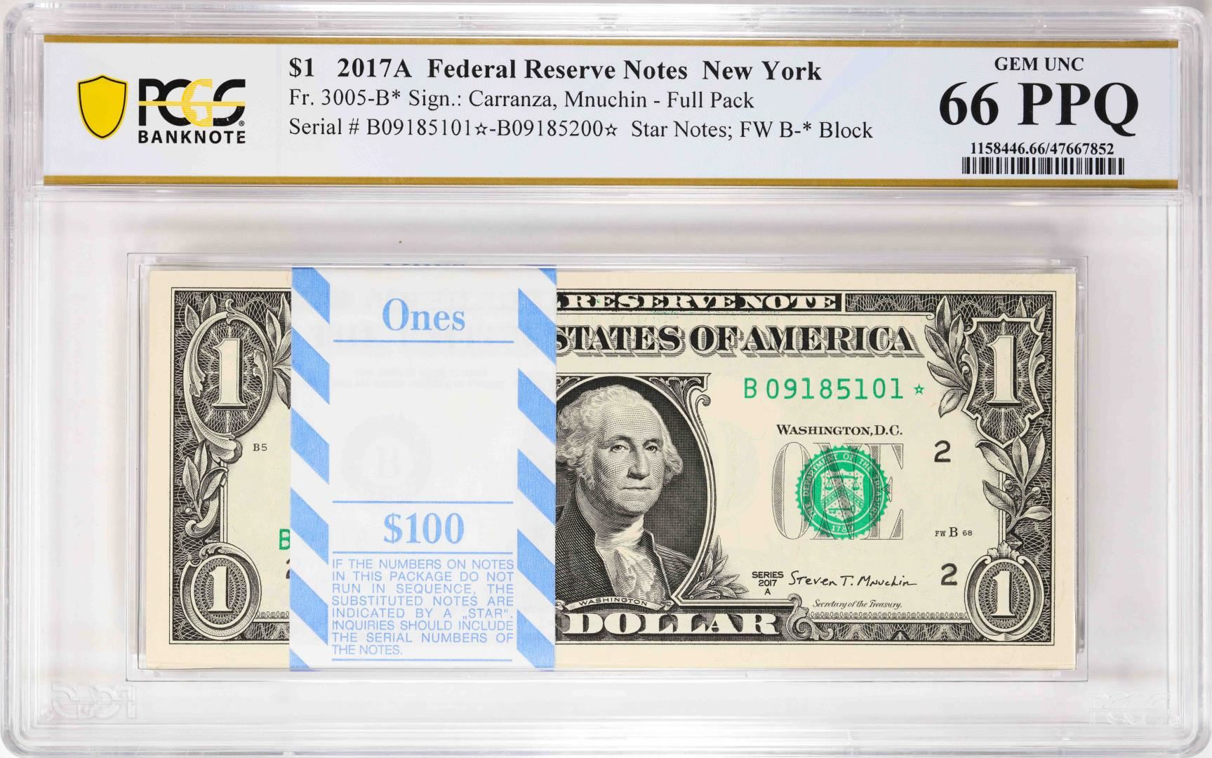 One Pack of 2017A $1 Federal Reserve STAR Notes New York Fr.3005-B* PCGS Gem Unc 66PPQ. PCGS Graded.