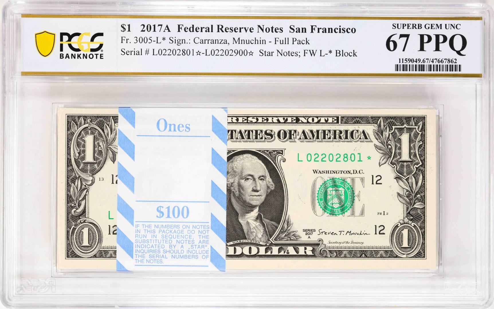 One Pack of 2017A $1 Federal Reserve STAR Notes SF Fr.3005-L* PCGS Superb Gem Unc 67PPQ. PCGS Graded.