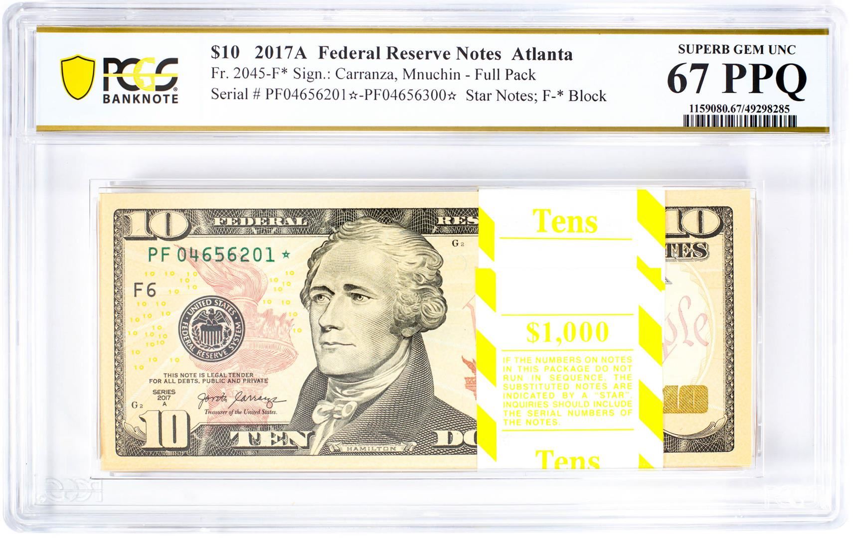 One Pack of 2017A $10 Federal Reserve STAR Notes ATL Fr.2045-F* PCGS Superb Gem UNC 67PPQ. PCGS Graded.