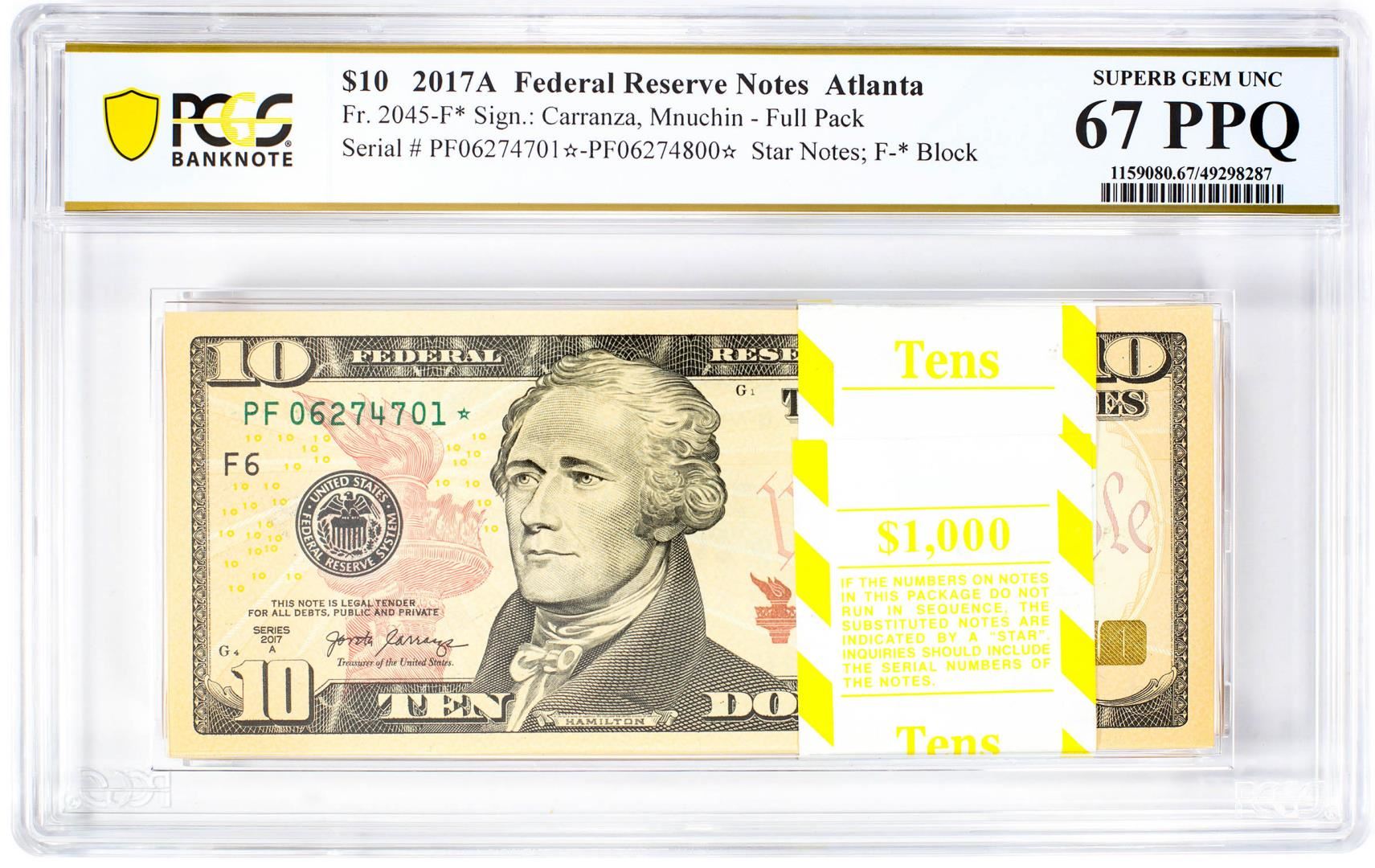 One Pack of 2017A $10 Federal Reserve STAR Notes ATL Fr.2045-F* PCGS Superb Gem UNC 67PPQ. PCGS Graded.