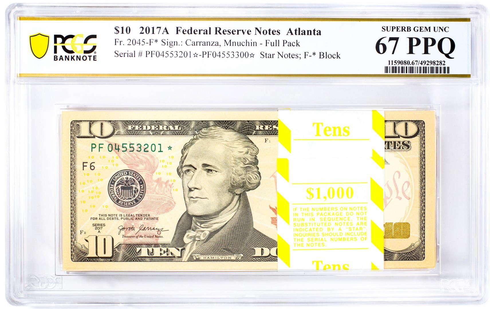 One Pack of 2017A $10 Federal Reserve STAR Notes ATL Fr.2045-F* PCGS Superb Gem UNC 67PPQ. PCGS Graded.
