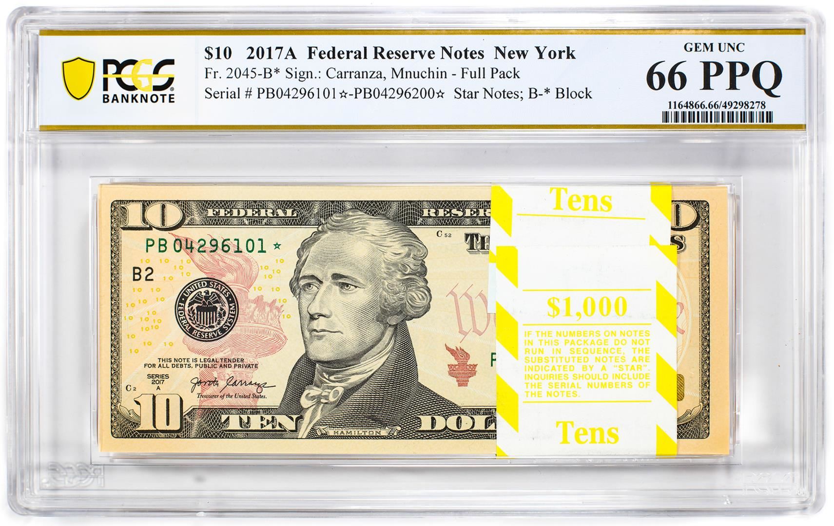 One Pack of 2017A $10 Federal Reserve STAR Notes New York Fr.2045-B* PCGS Gem UNC 66PPQ. PCGS Graded.