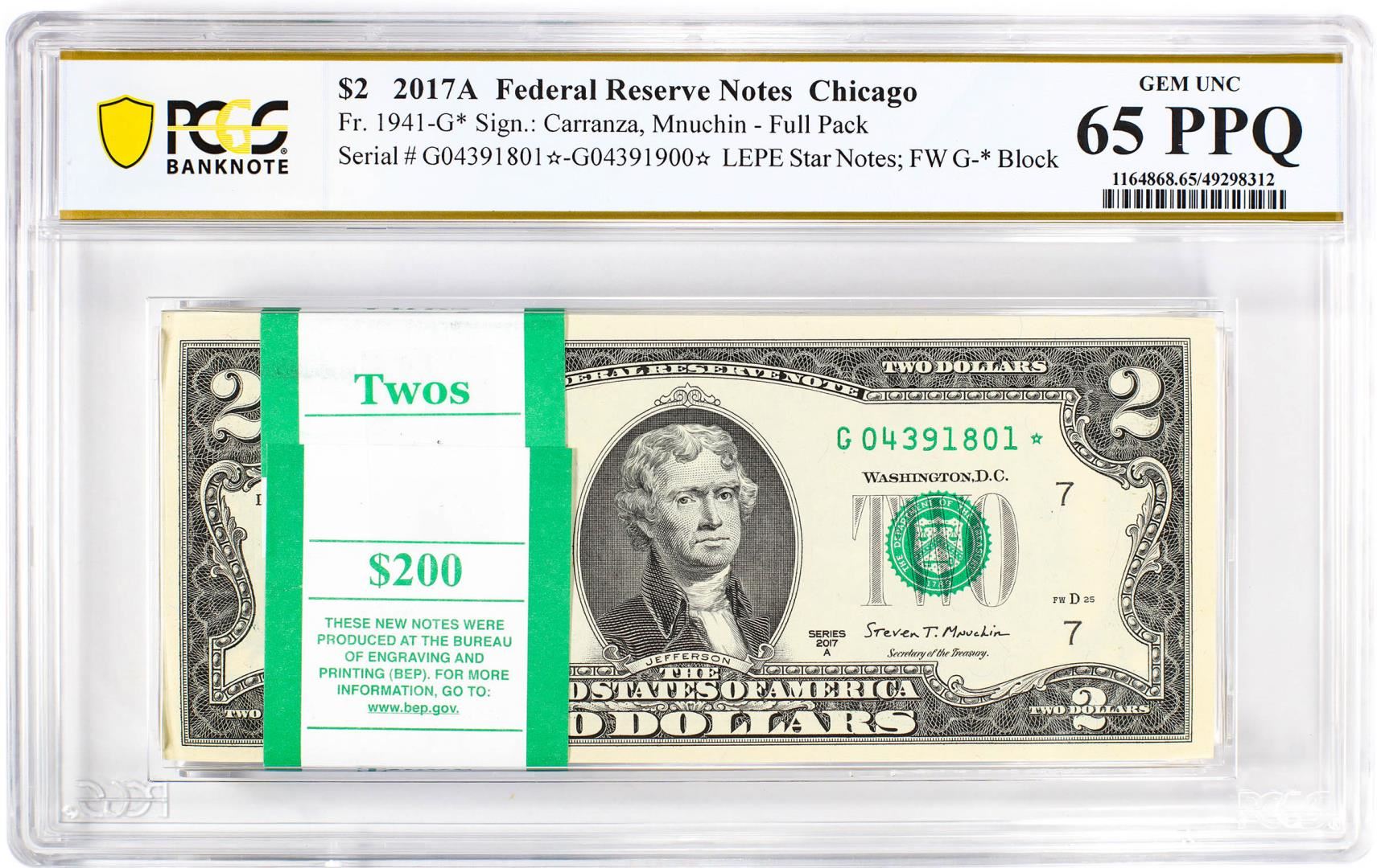 One Pack of 2017A $2 Federal Reserve STAR Notes Chicago Fr.1941-G* PCGS Gem UNC 65PPQ. PCGS Graded.