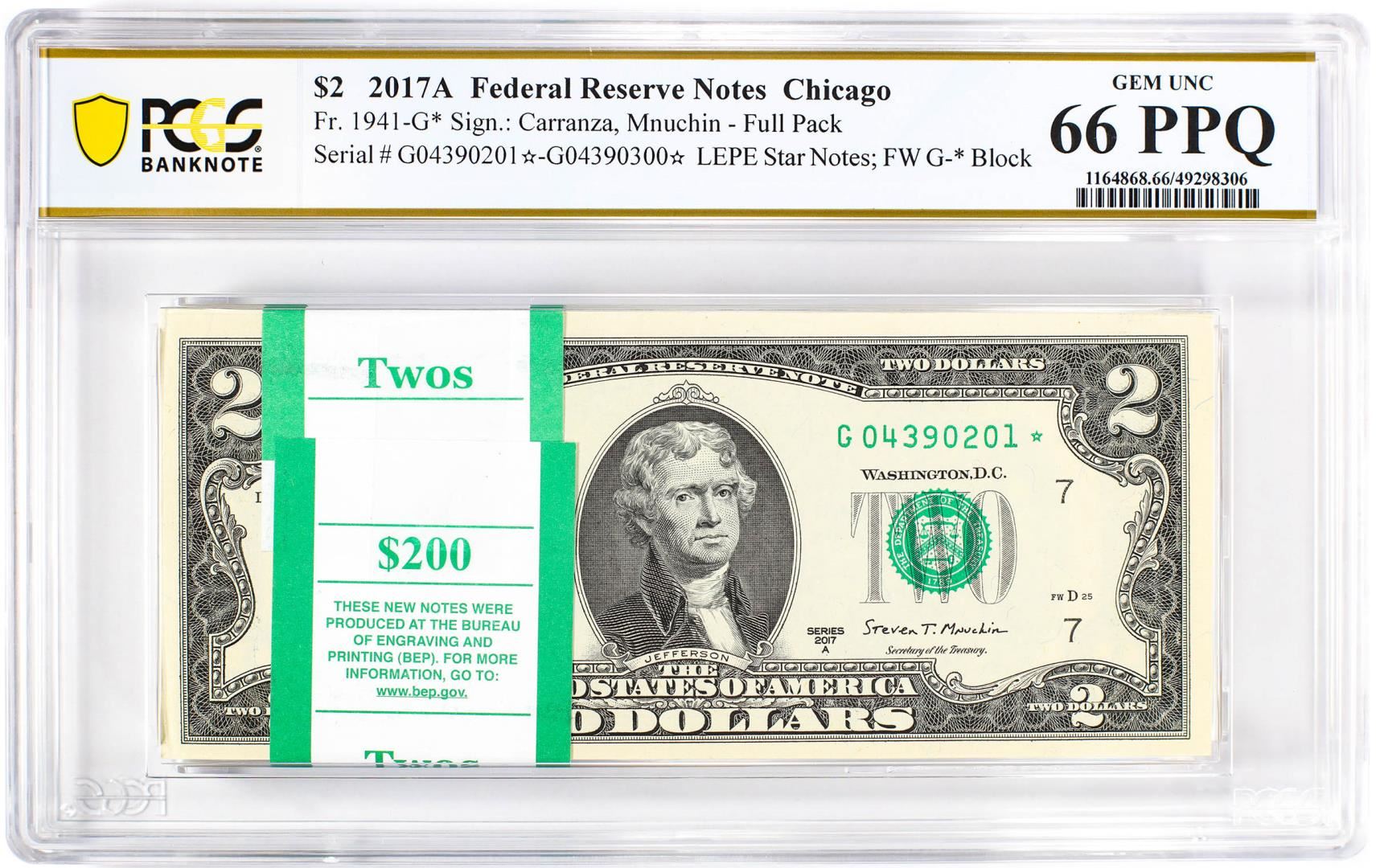 One Pack of 2017A $2 Federal Reserve STAR Notes Chicago Fr.1941-G* PCGS Gem UNC 66PPQ. PCGS Graded.
