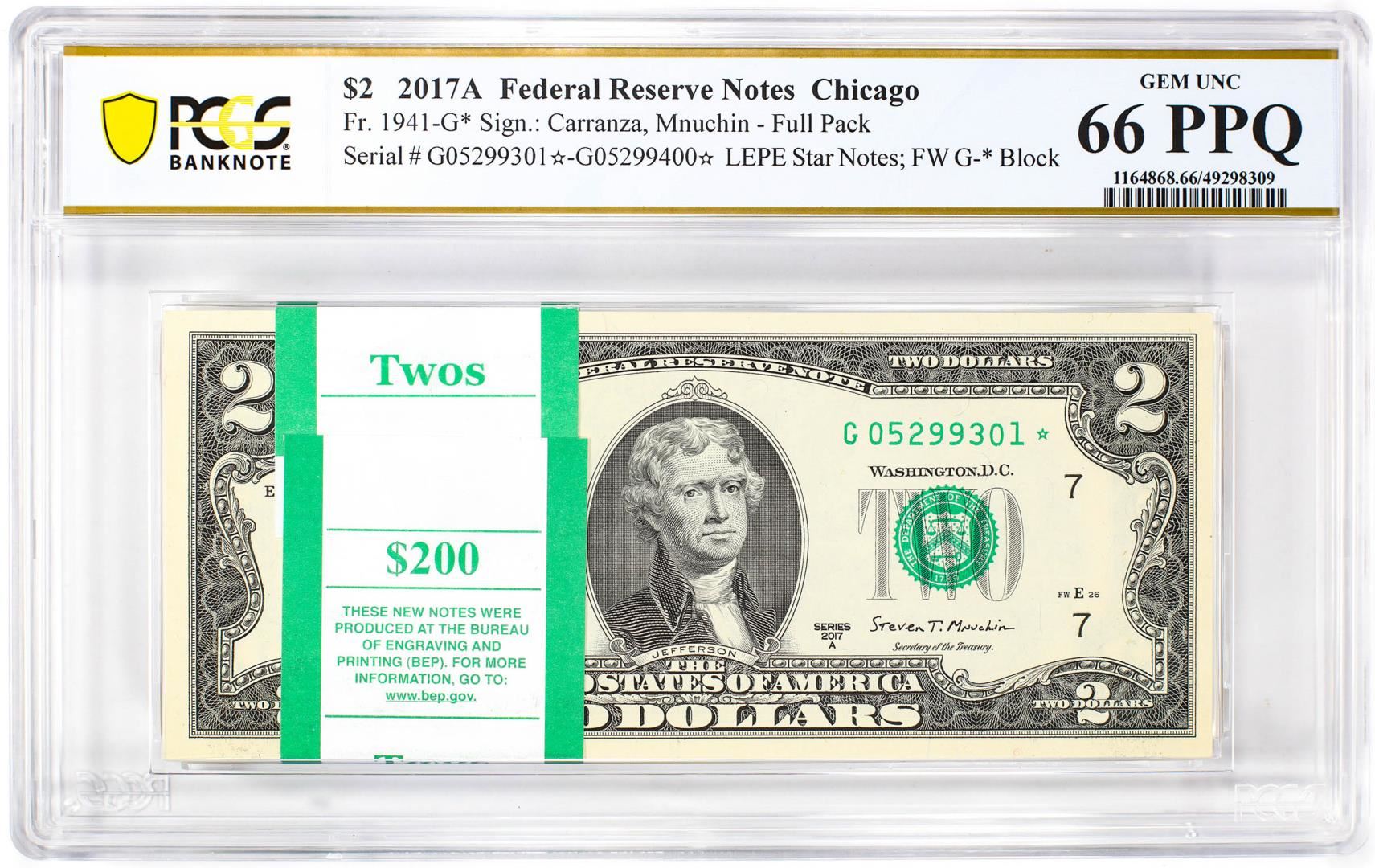 One Pack of 2017A $2 Federal Reserve STAR Notes Chicago Fr.1941-G* PCGS Gem UNC 66PPQ. PCGS Graded.