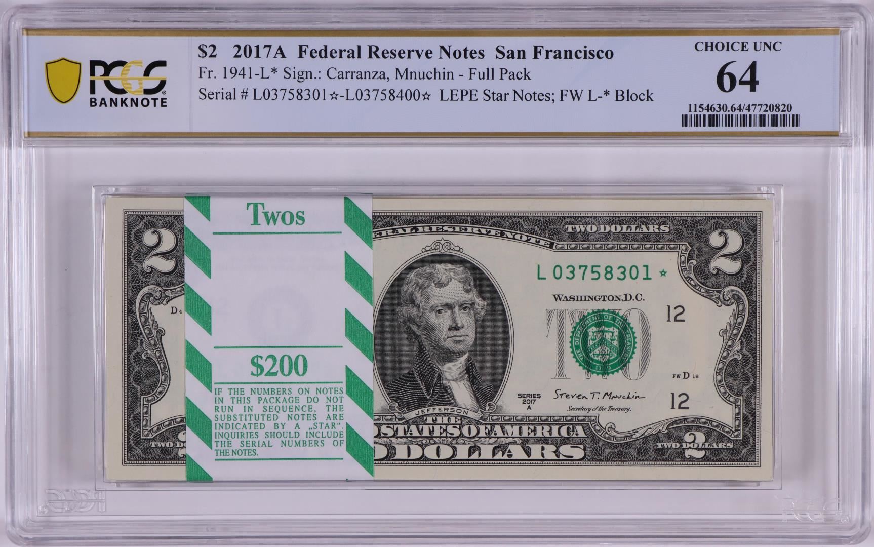 One Pack of 2017A $2 Federal Reserve STAR Notes SF Fr.1941-L* PCGS Choice Uncirculated 64. PCGS Graded.