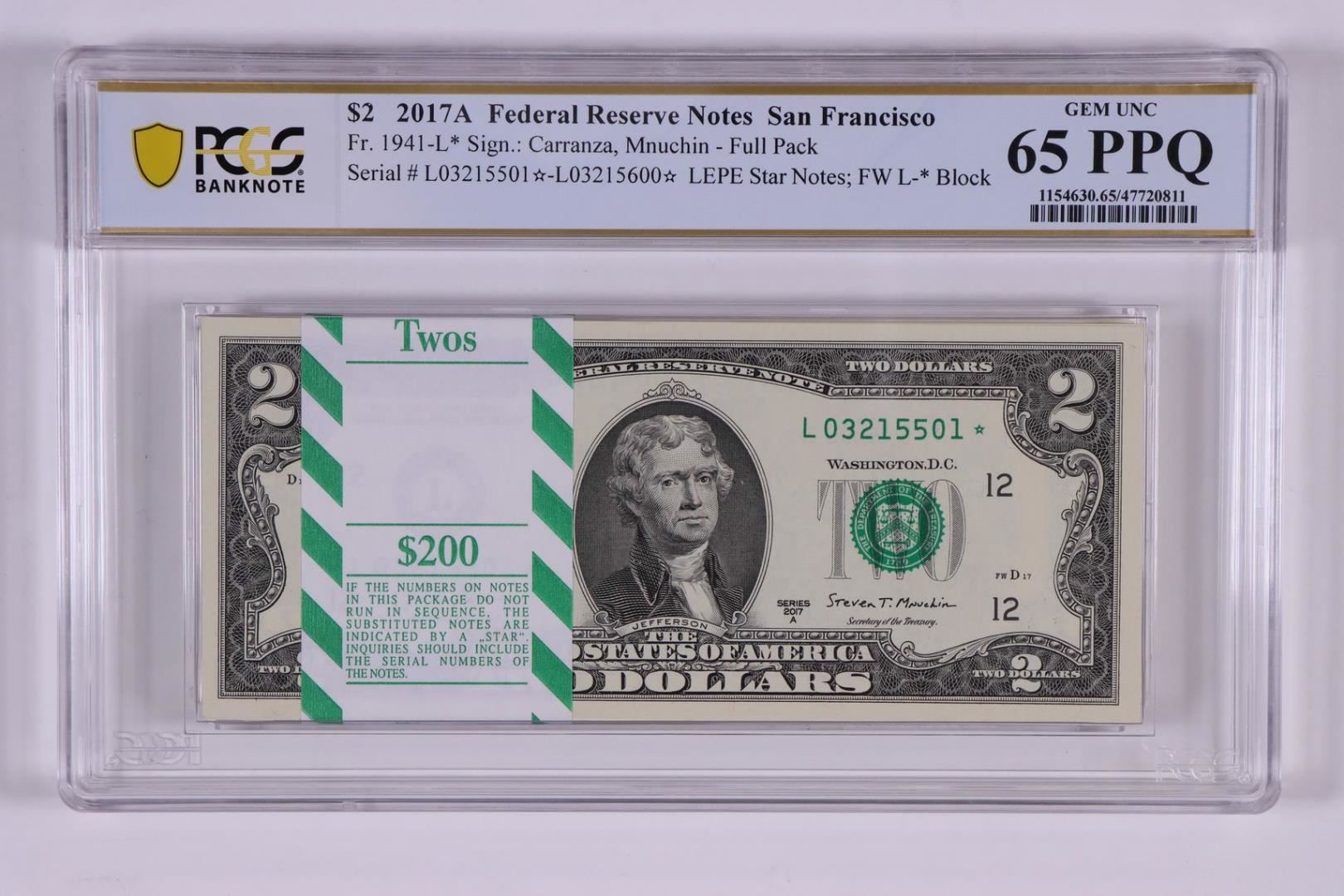 One Pack of 2017A $2 Federal Reserve STAR Notes SF Fr.1941-L* PCGS Gem Uncirculated 65PPQ. PCGS Graded.