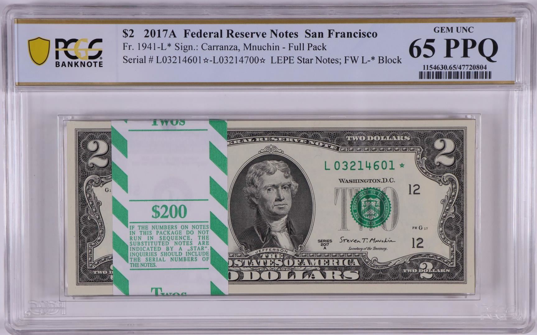 One Pack of 2017A $2 Federal Reserve STAR Notes SF Fr.1941-L* PCGS Gem Uncirculated 65PPQ. PCGS Graded.
