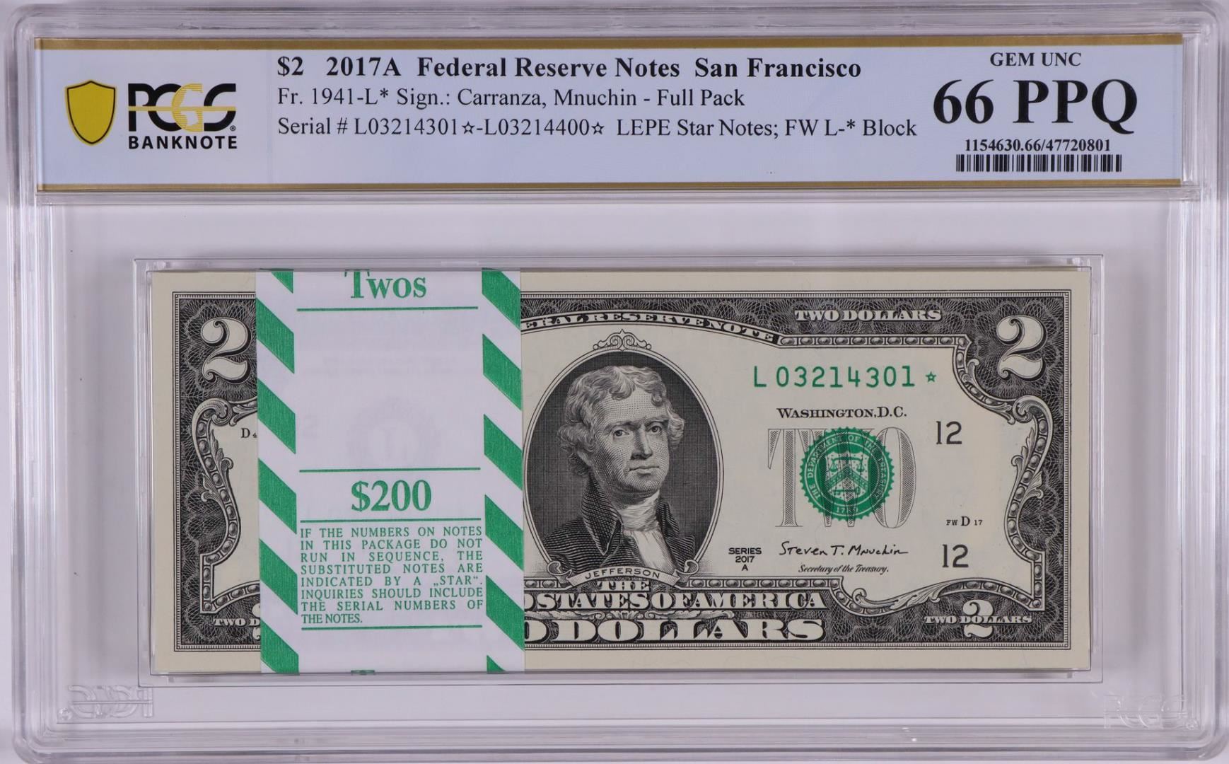 One Pack of 2017A $2 Federal Reserve STAR Notes SF Fr.1941-L* PCGS Gem Uncirculated 66PPQ. PCGS Graded.