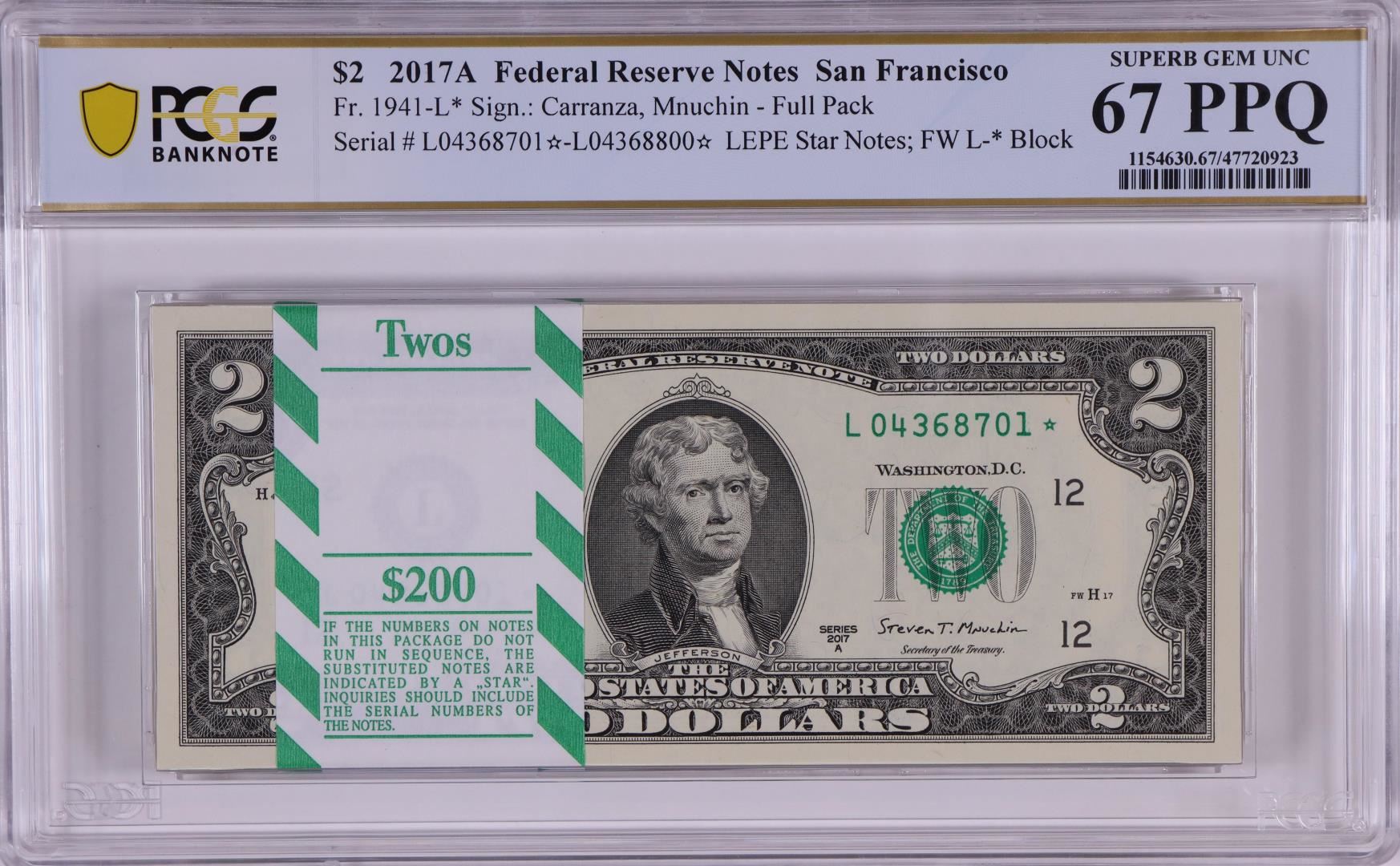 One Pack of 2017A $2 Federal Reserve STAR Notes SF Fr.1941-L* PCGS Superb Gem UNC 67PPQ. PCGS Graded.