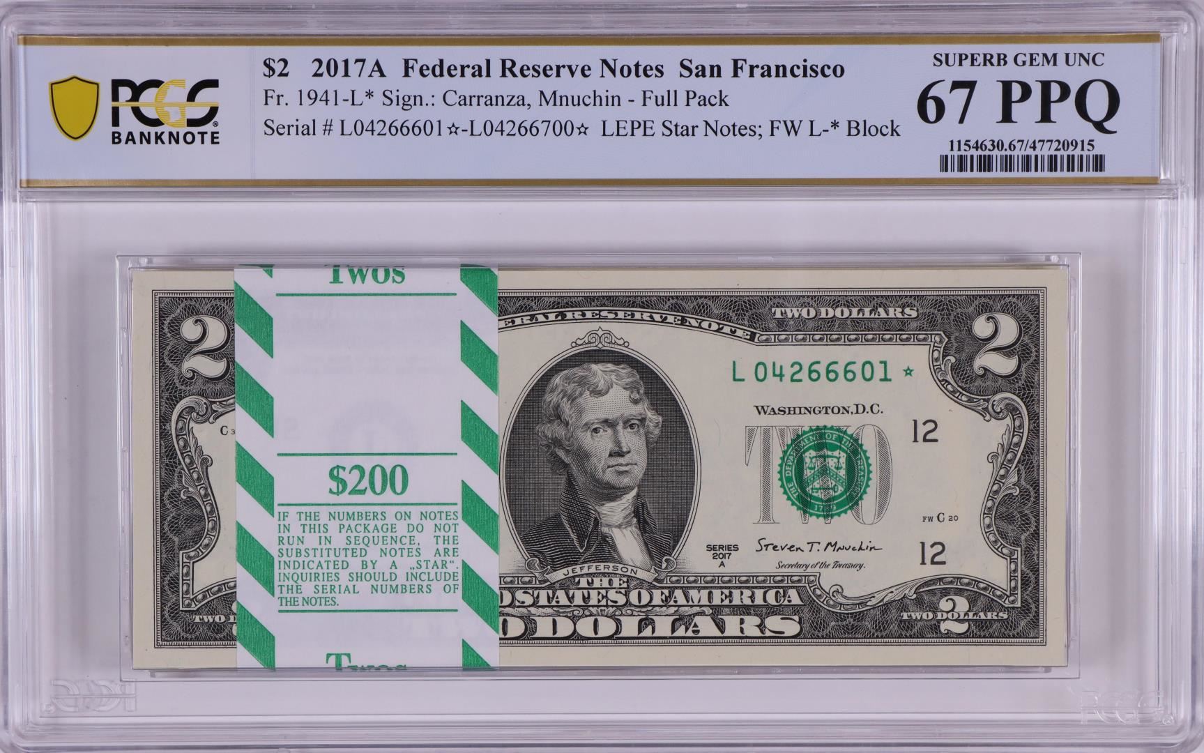 One Pack of 2017A $2 Federal Reserve STAR Notes SF Fr.1941-L* PCGS Superb Gem UNC 67PPQ. PCGS Graded.