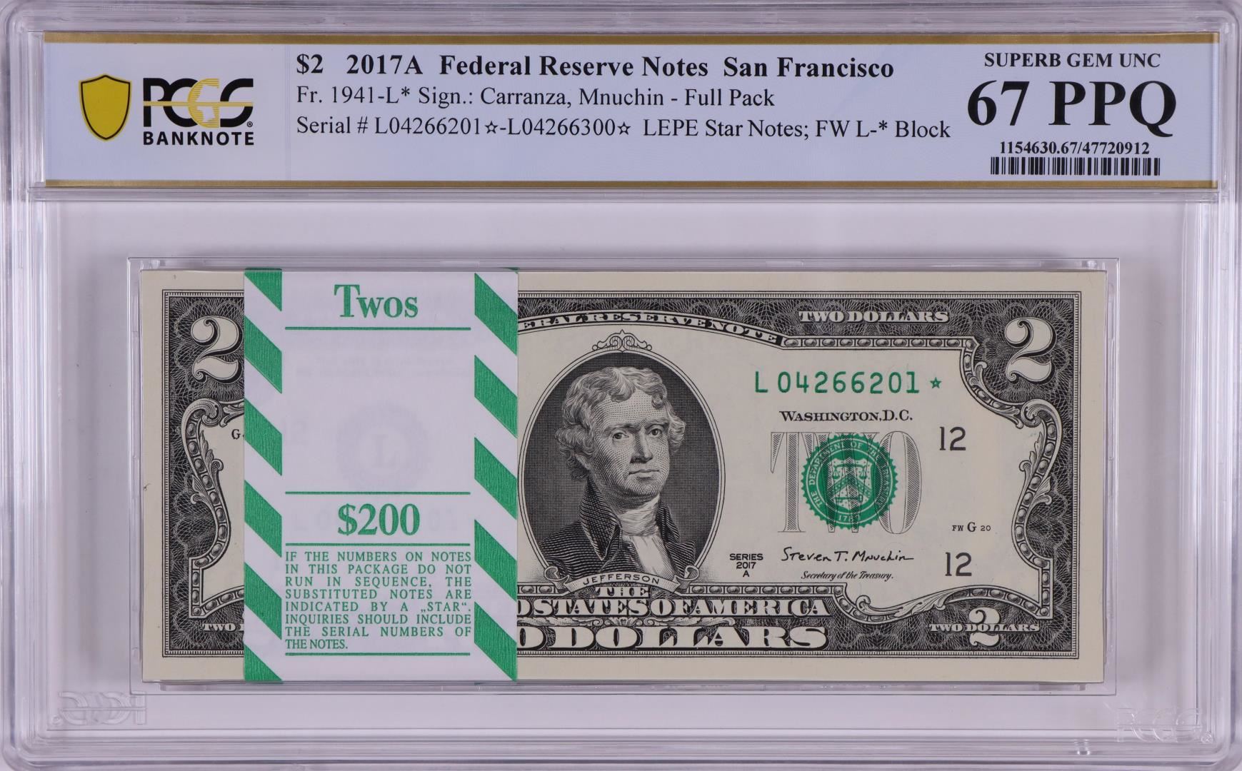 One Pack of 2017A $2 Federal Reserve STAR Notes SF Fr.1941-L* PCGS Superb Gem UNC 67PPQ. PCGS Graded.